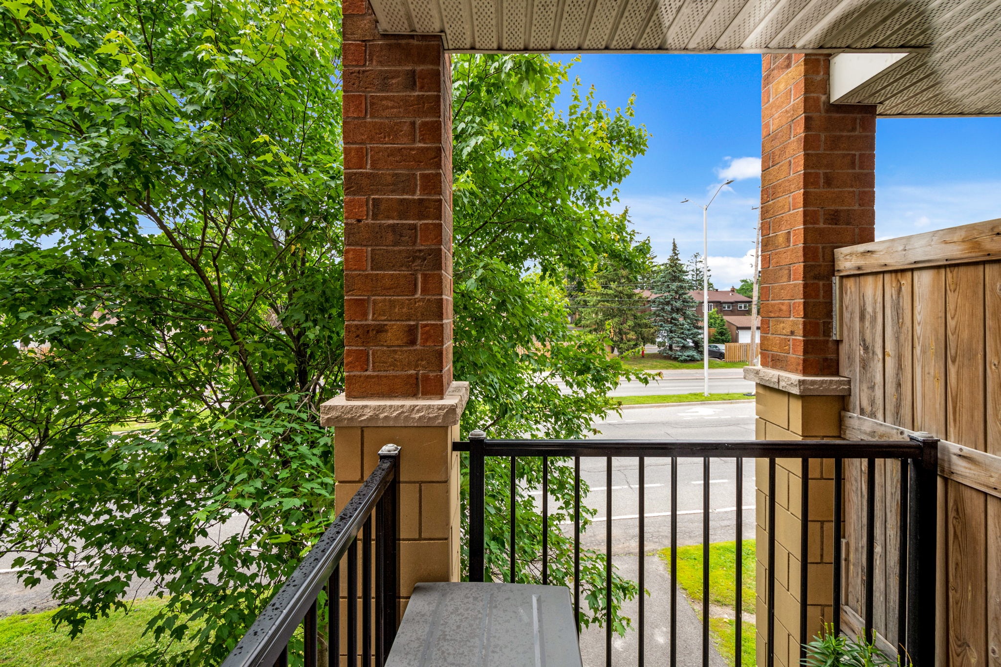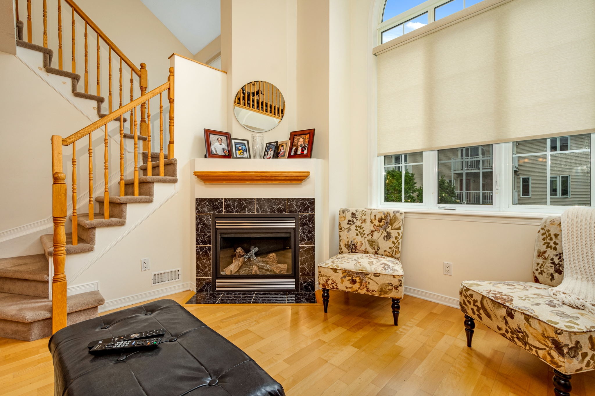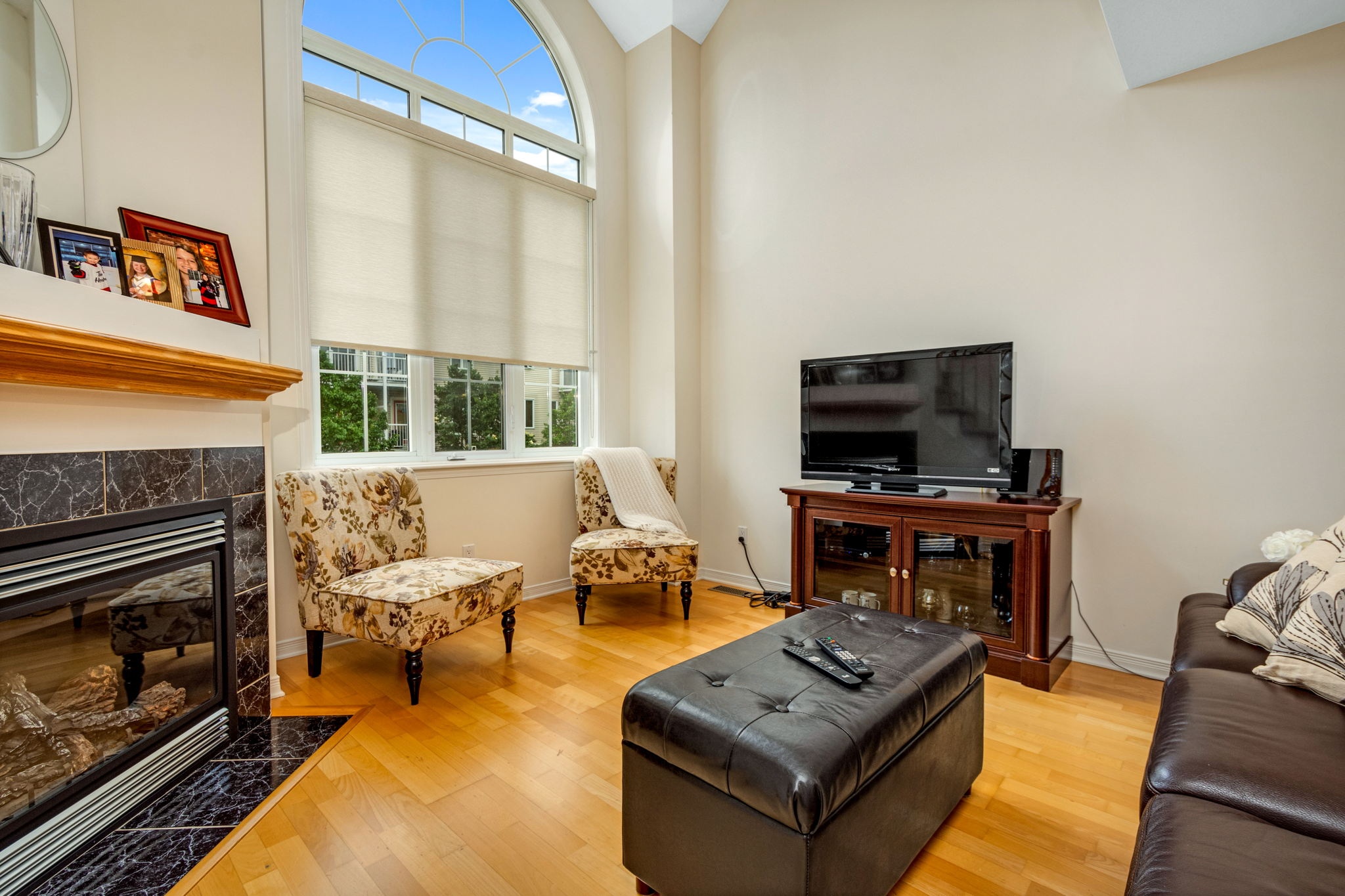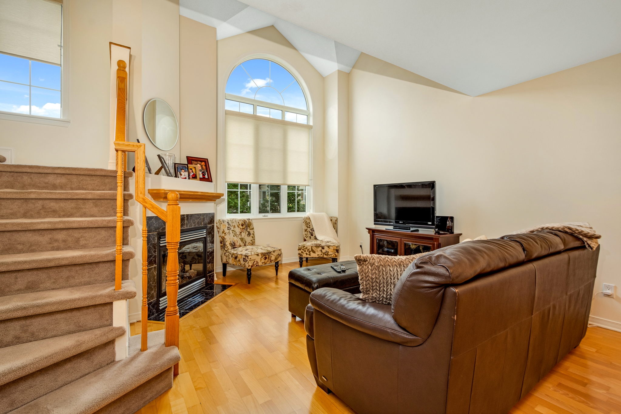 Welcome to this spacious, sun filled, open concept terrace home - perfect for First time buyers, investors or those looking to right-size! The main level layout presents an adjoining dining room and living room with striking vaulted ceiling open to above, a corner gas fireplace and a large palladium window that fills the space with natural light. A well-designed kitchen outfitted with ample cabinetry and counter space and a useful island with bar seating is ideal for casual entertaining and meal prep. Upstairs, you will discover the primary bedroom with cheater door access to a full bathroom and a private balcony, a generous second bedroom, and a multipurpose den, perfect for a home office, yoga room or reading corner. Close to schools, shopping and more. Public transit at your doorstep. One surfaced parking space included.