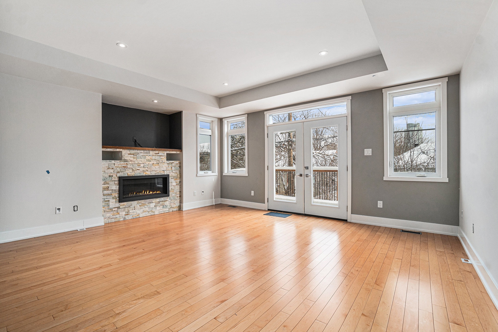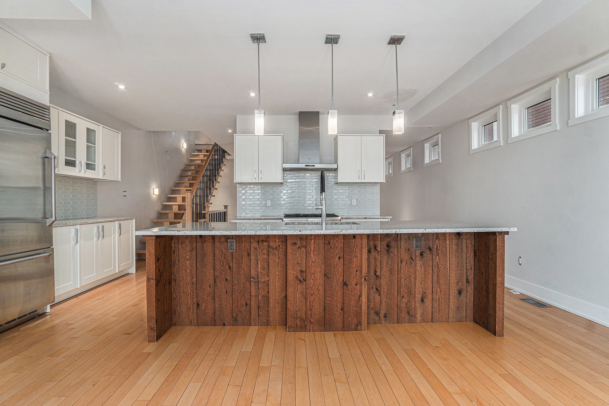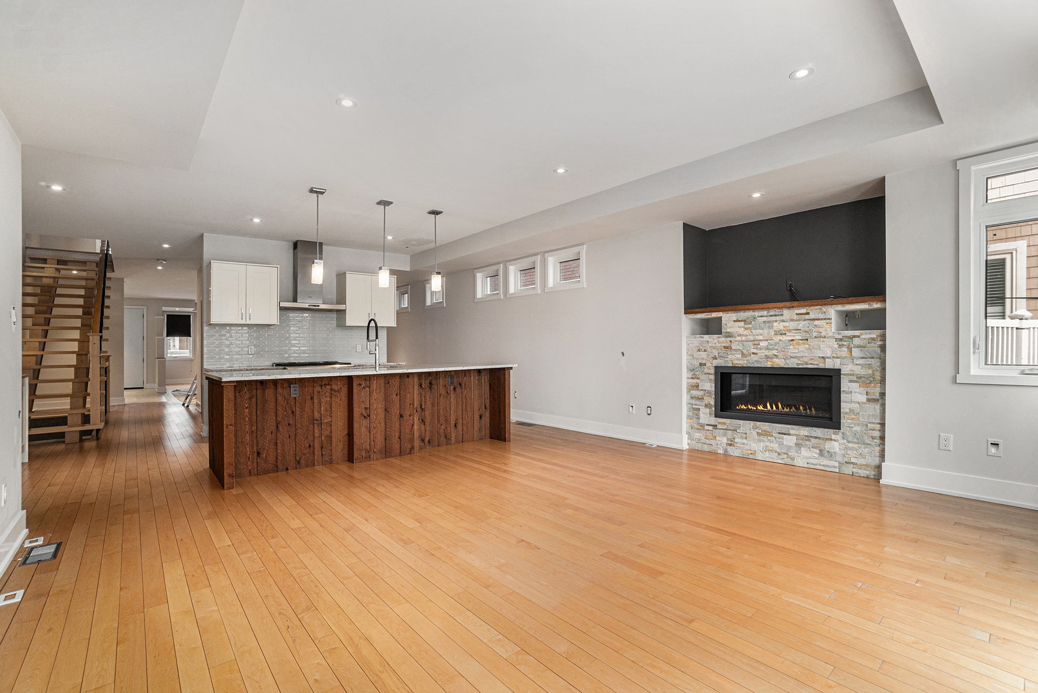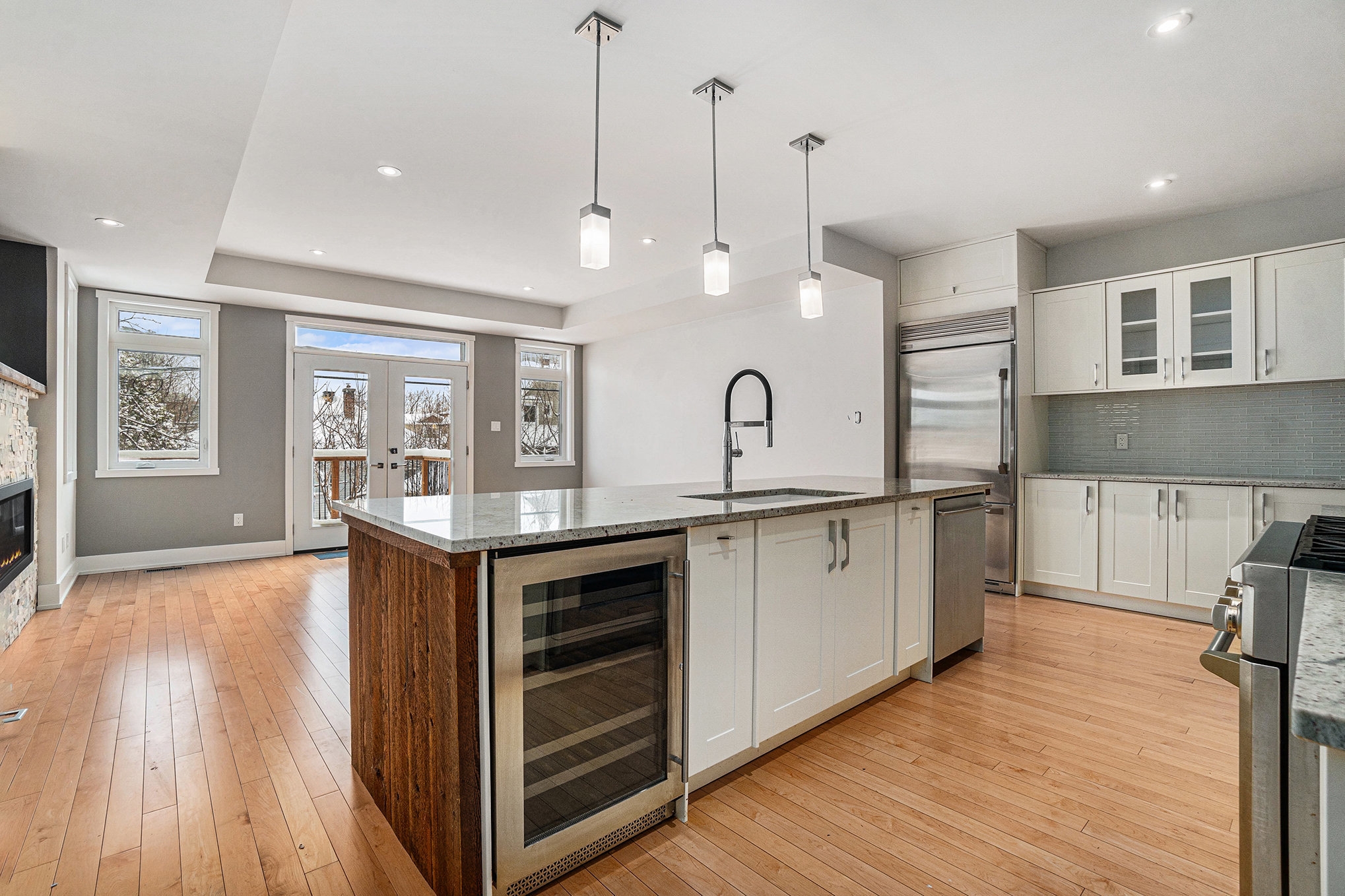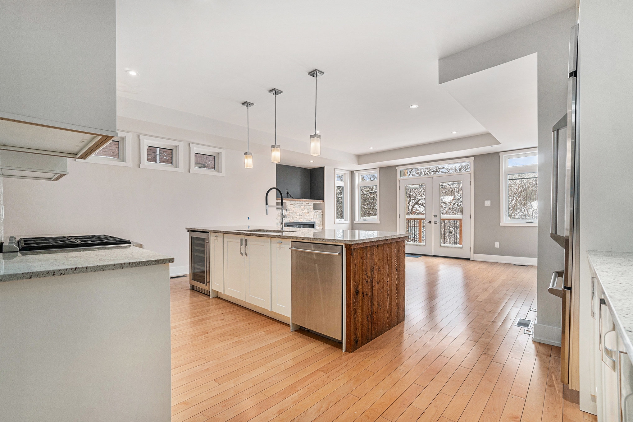 and stone accents. The chef-inspired kitchen boasts granite countertops, high-end appliances, and a large island. A deck and fenced yard off the family room and is perfect for outdoor entertaining. The second floor is home to three bright, spacious bedrooms, including the primary suite, with a luxury 5pc ensuite and a private balcony overlooking the Ottawa River. The lower level features a versatile 4th bedroom, ideal as an office