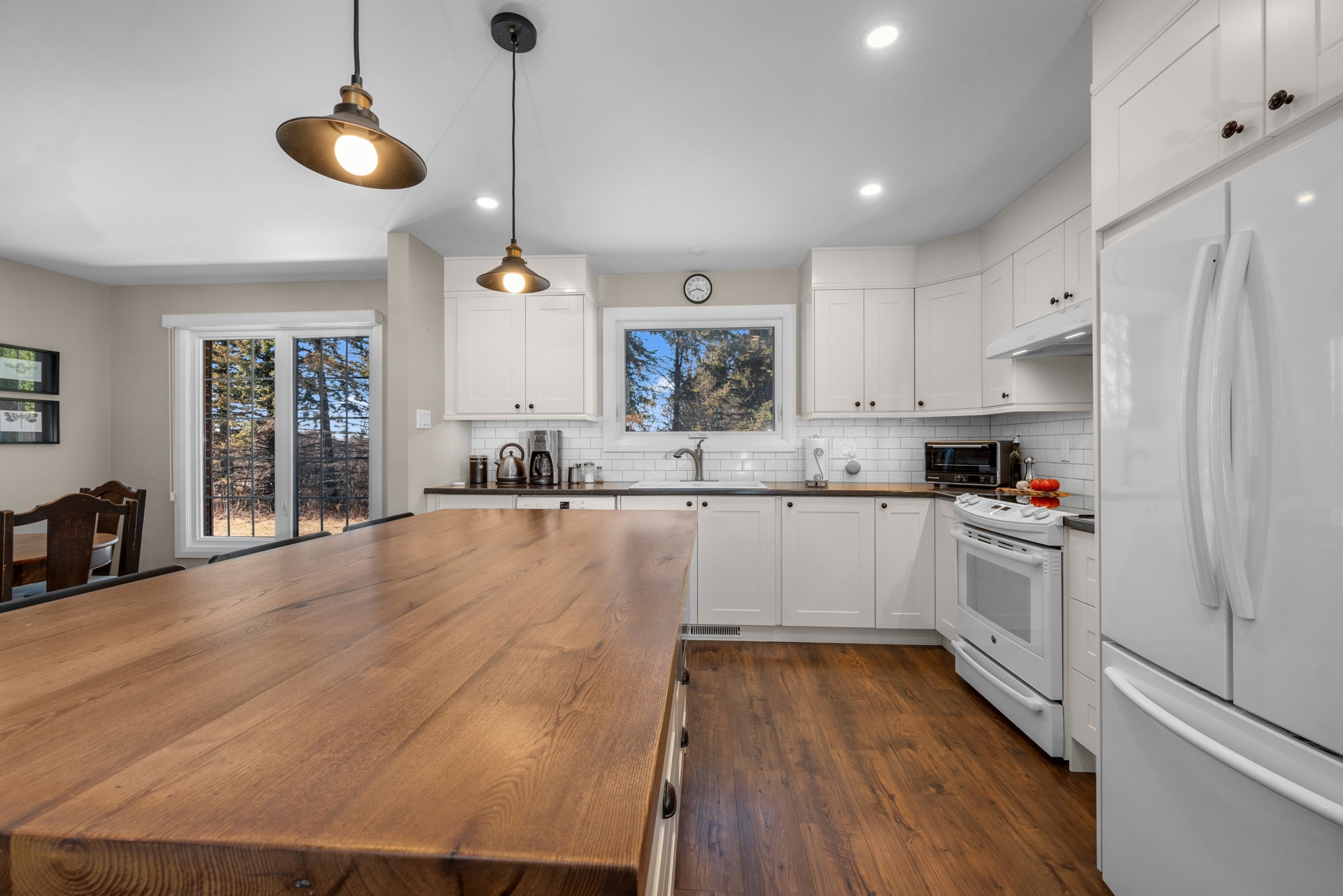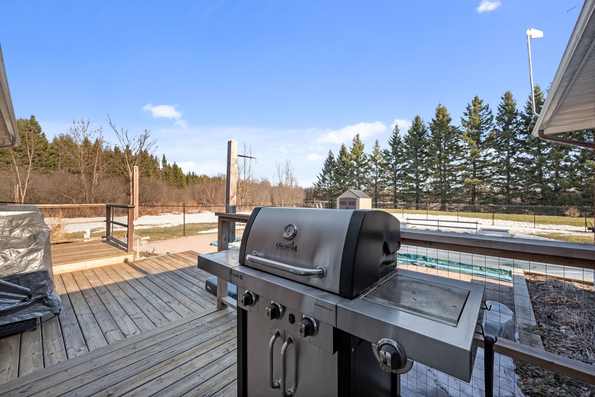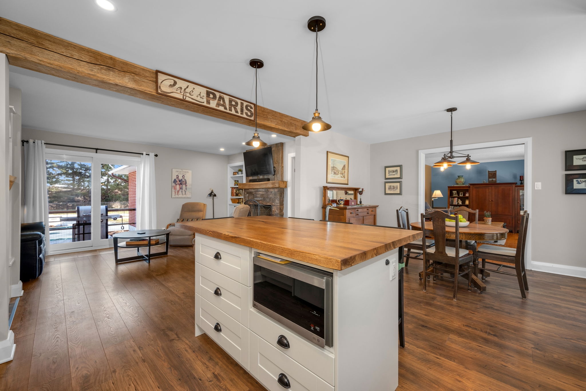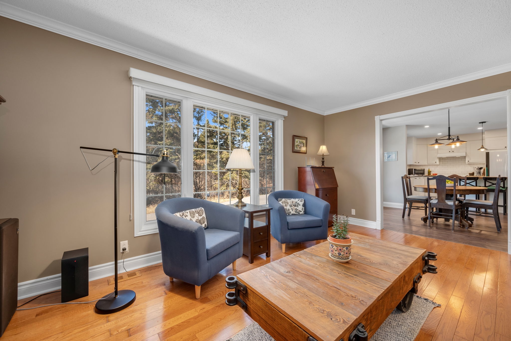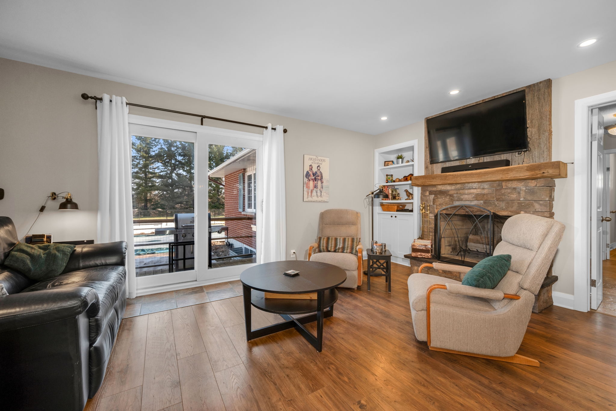 Nestled on a sprawling lot surrounded by mature trees, this beautifully designed 3-bedroom bungalow offers a perfect blend of comfort and functionality. With a thoughtful layout and inviting living spaces, this home is ideal for both relaxation and entertaining.Step into the spacious living room, where large windows flood the space with natural light, creating a warm and welcoming atmosphere. The chefs kitchen is a standout feature, complete with a generous island, breakfast bar seating, and seamless flow into the eating area and dining room perfect for gathering with family and friends.The cozy family room, highlighted by a wood-burning fireplace, provides direct access to the backyard deck, making indoor-outdoor living effortless. The primary bedroom boasts a private ensuite, while two additional well-sized bedrooms offer comfortable accommodations for family or guests.Downstairs, the finished basement provides bonus living space, ideal for a recreation room, home gym, or media lounge, along with a dedicated workshop for hobbyists and DIY enthusiasts.Outside, the expansive backyard is a true oasis, featuring an inground pool surrounded by lush greenery, offering a private retreat for summer enjoyment. Whether you're hosting barbecues, relaxing by the pool, or enjoying the natural surroundings, this home delivers the perfect balance of tranquility and convenience.