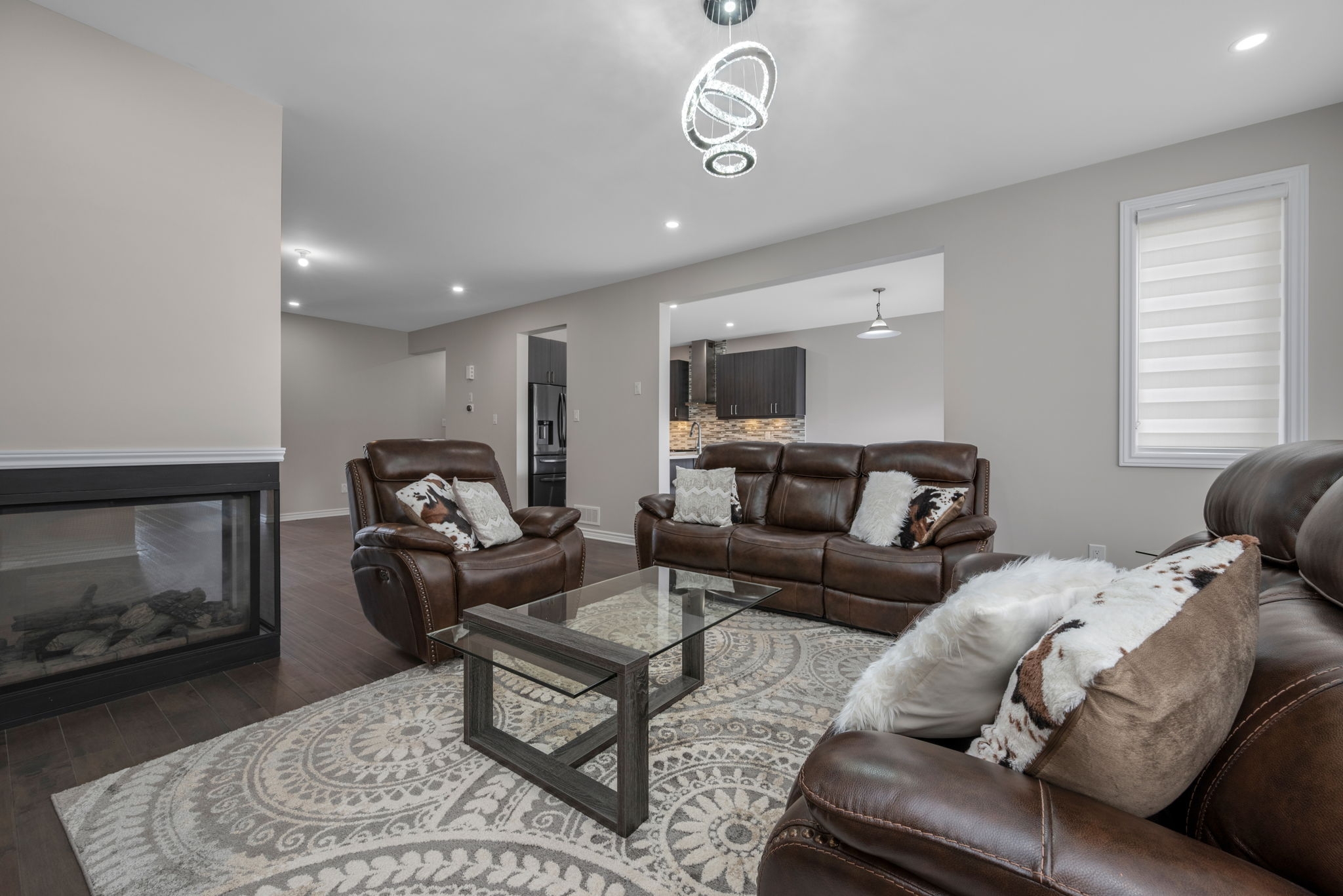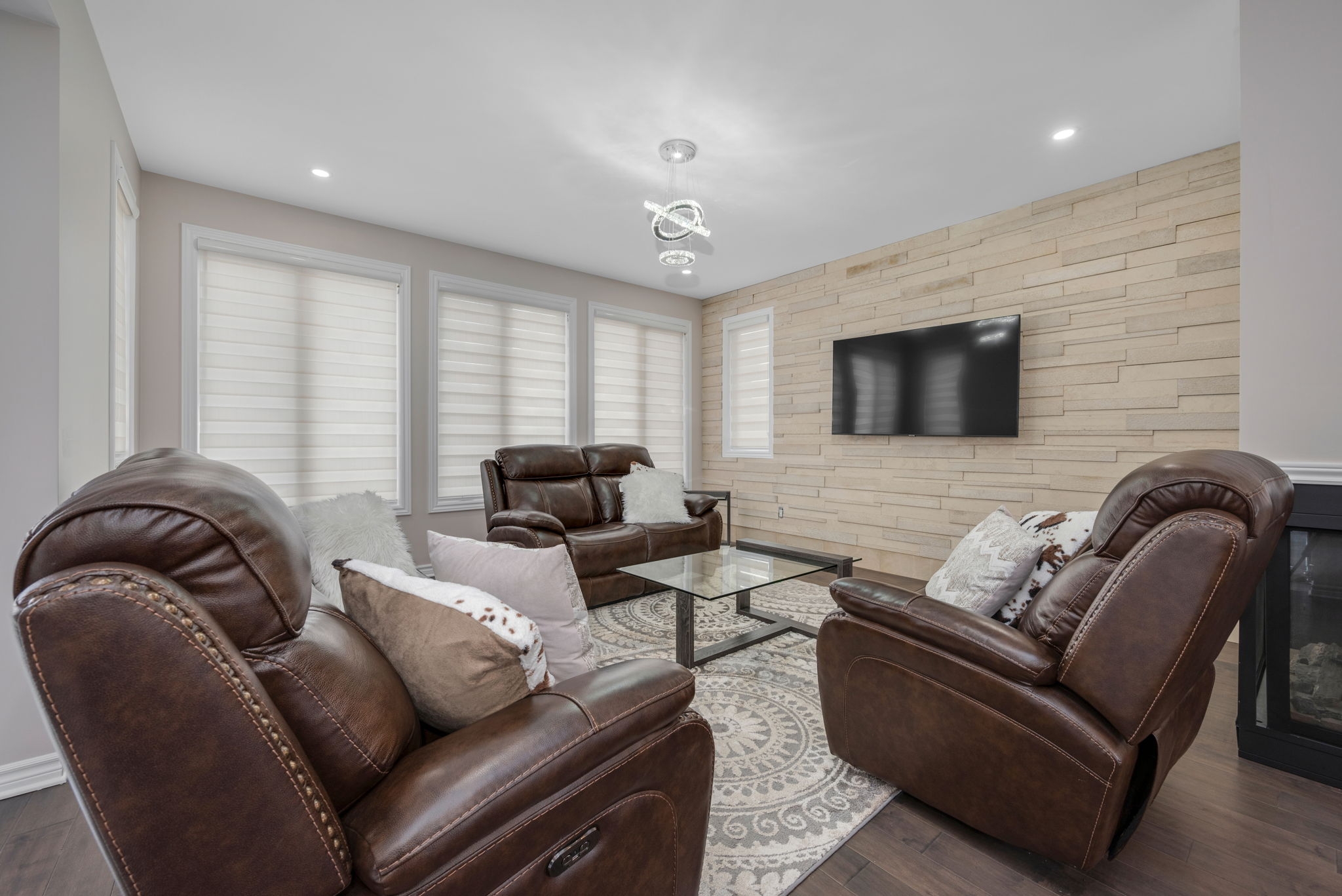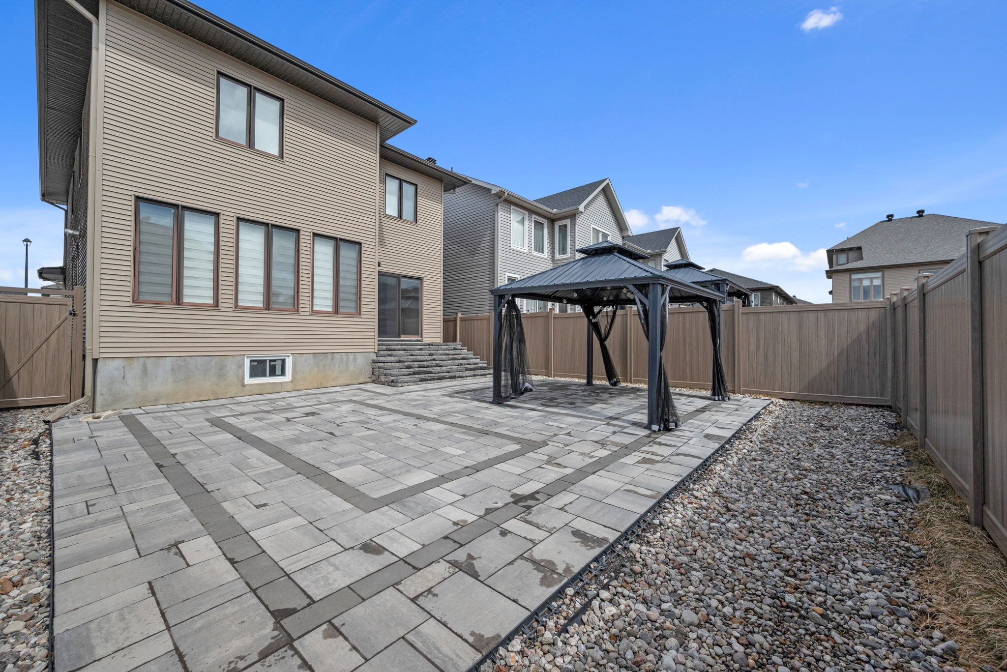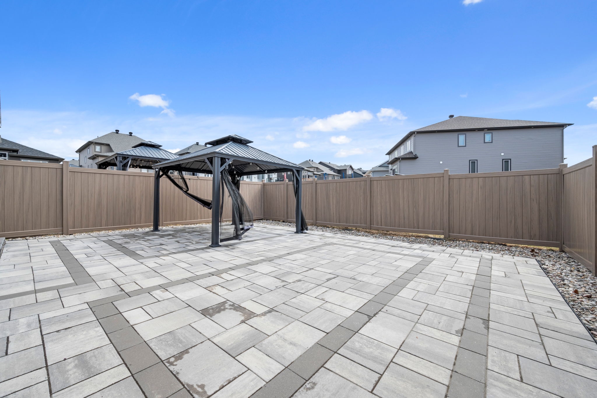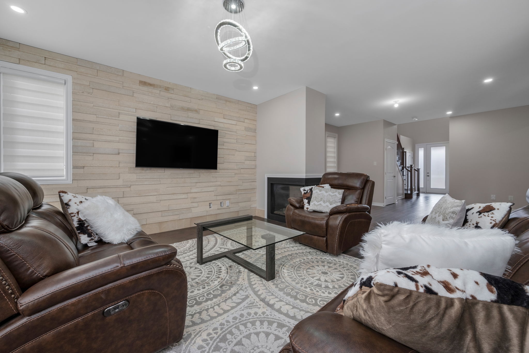 This stunning contemporary home offers a perfect blend of modern design, spacious comfort, and functional layout. The striking curb appeal sets the tone for an interior that boasts seamless flow throughout its open-concept main level. Rich hardwood flooring leads you into a bright and airy living space featuring a stylish stone accent wall and a sleek three-sided fireplace that adds warmth and elegance to both the living and dining areas. The chef-inspired kitchen is outfitted with dark modern cabinetry, quartz countertops, a chic glass tile backsplash, premium stainless steel appliances, and a dedicated eating area overlooking the backyard. Upstairs, the generously sized primary suite is filled with natural light and features a spa-like ensuite with a soaker tub and glass shower, accompanied by three additional spacious bedrooms and a full bath. The fully finished basement adds versatile living space along with an additional bathroom perfect for a home office, gym, or guest suite. Outside, the fully fenced backyard features beautiful interlock stonework and a covered gazebo, creating the perfect setting for outdoor dining, relaxing, or entertaining.