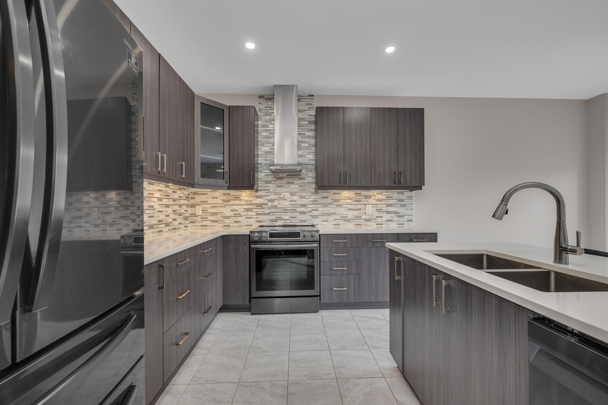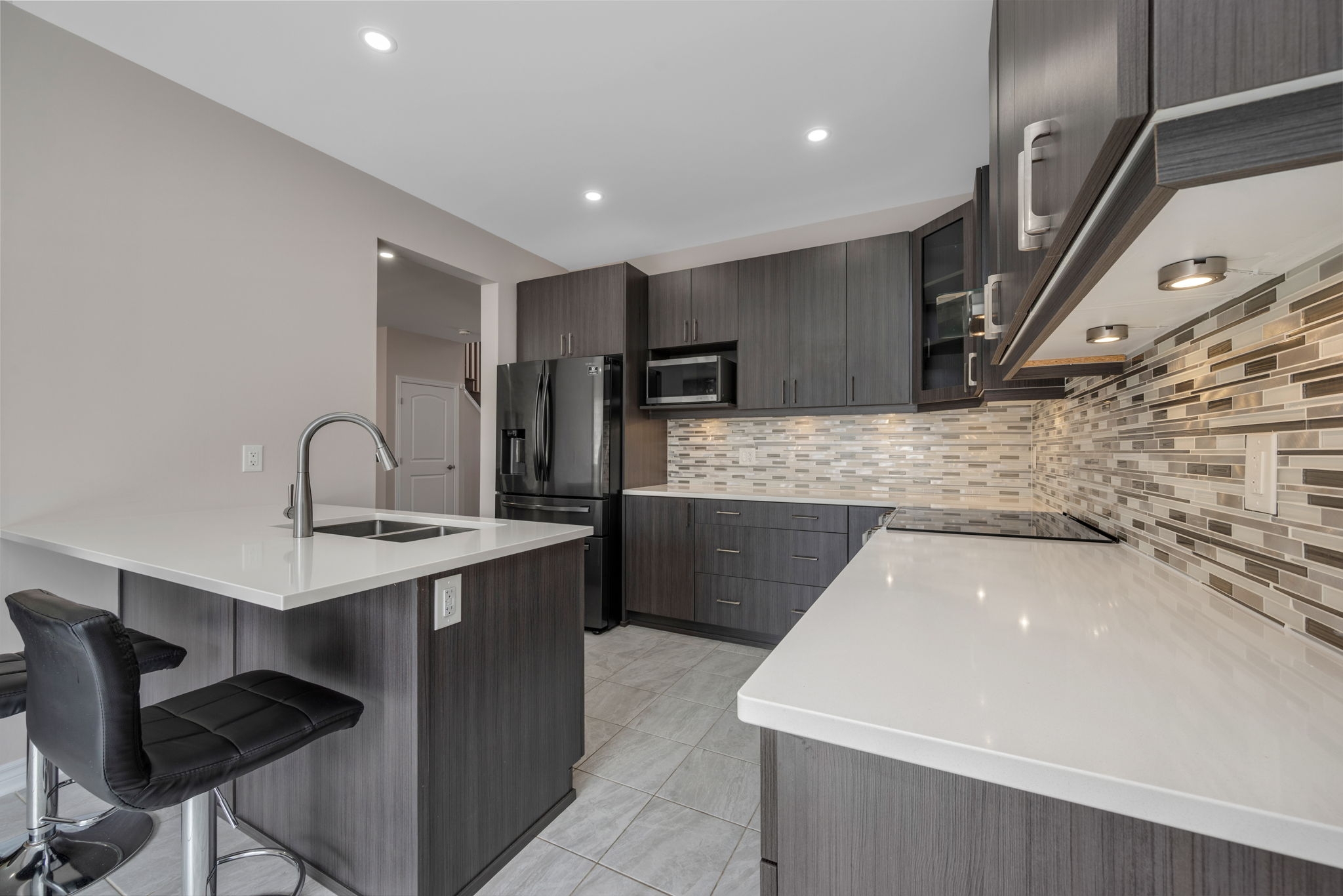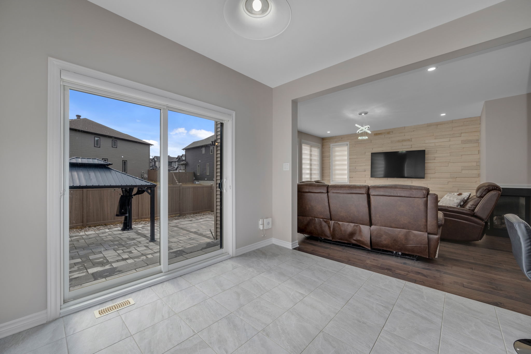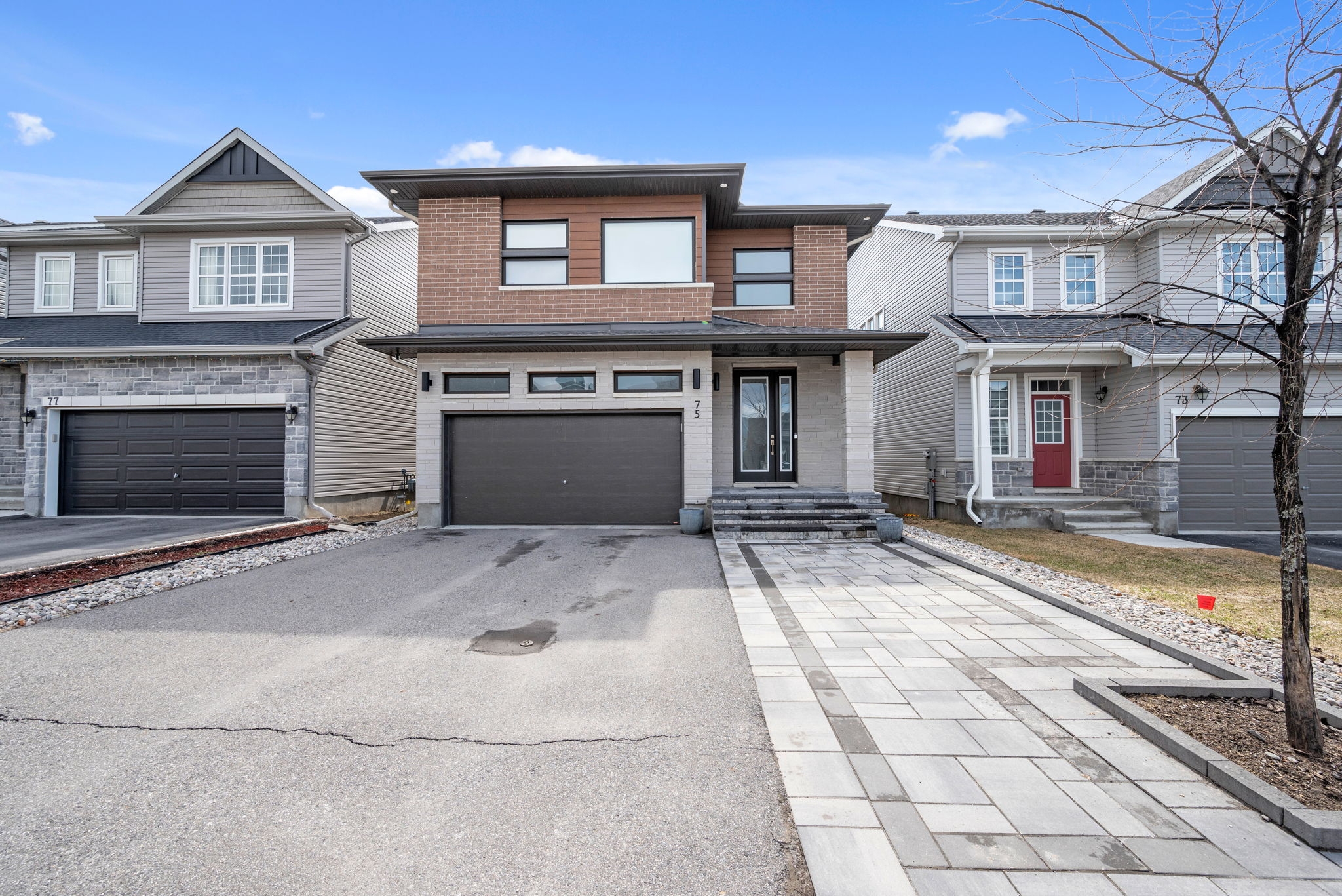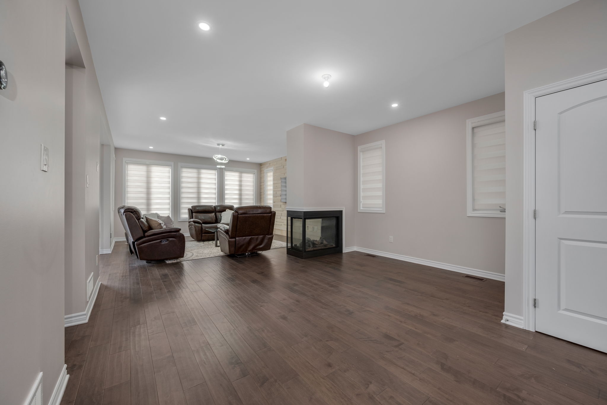 This stunning contemporary home offers a perfect blend of modern design, spacious comfort, and functional layout. The striking curb appeal sets the tone for an interior that boasts seamless flow throughout its open-concept main level. Rich hardwood flooring leads you into a bright and airy living space featuring a stylish stone accent wall and a sleek three-sided fireplace that adds warmth and elegance to both the living and dining areas. The chef-inspired kitchen is outfitted with dark modern cabinetry, quartz countertops, a chic glass tile backsplash, premium stainless steel appliances, and a dedicated eating area overlooking the backyard. Upstairs, the generously sized primary suite is filled with natural light and features a spa-like ensuite with a soaker tub and glass shower, accompanied by three additional spacious bedrooms and a full bath. The fully finished basement adds versatile living space along with an additional bathroom perfect for a home office, gym, or guest suite. Outside, the fully fenced backyard features beautiful interlock stonework and a covered gazebo, creating the perfect setting for outdoor dining, relaxing, or entertaining.