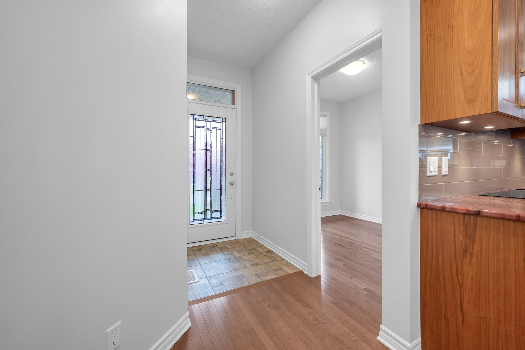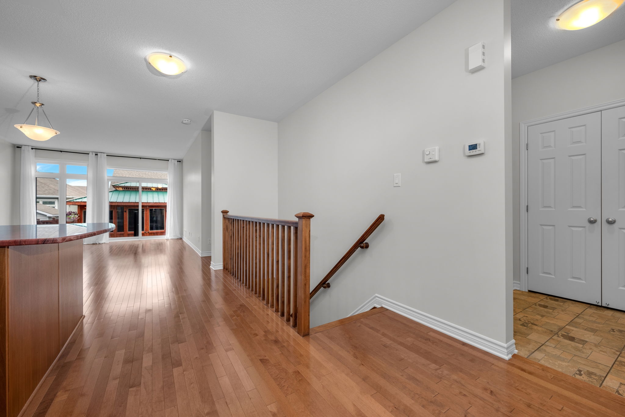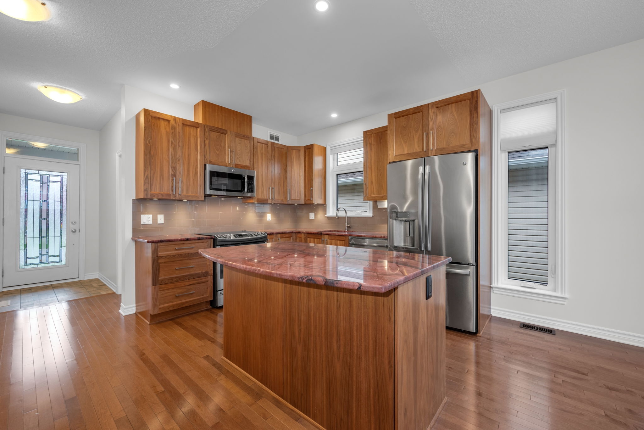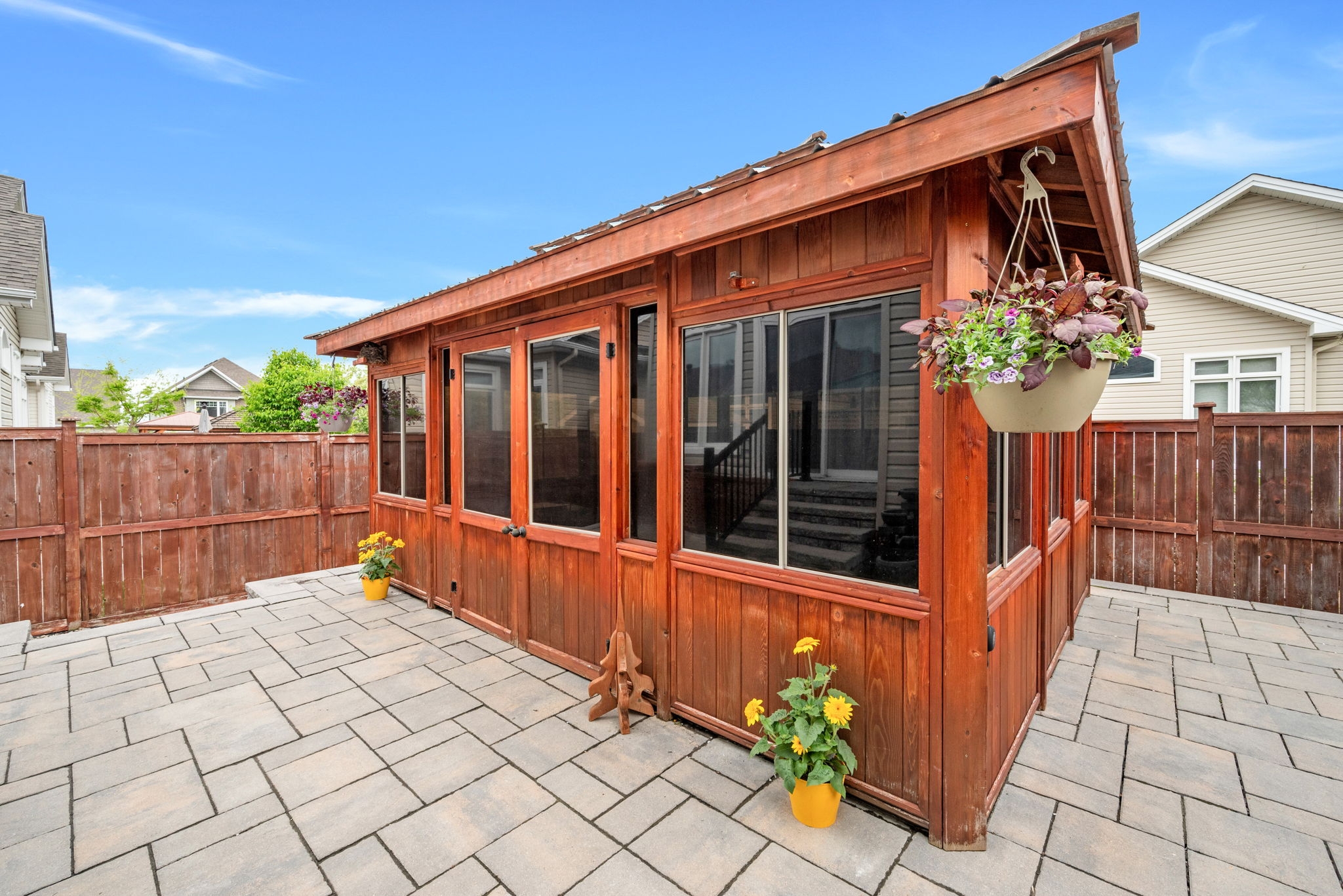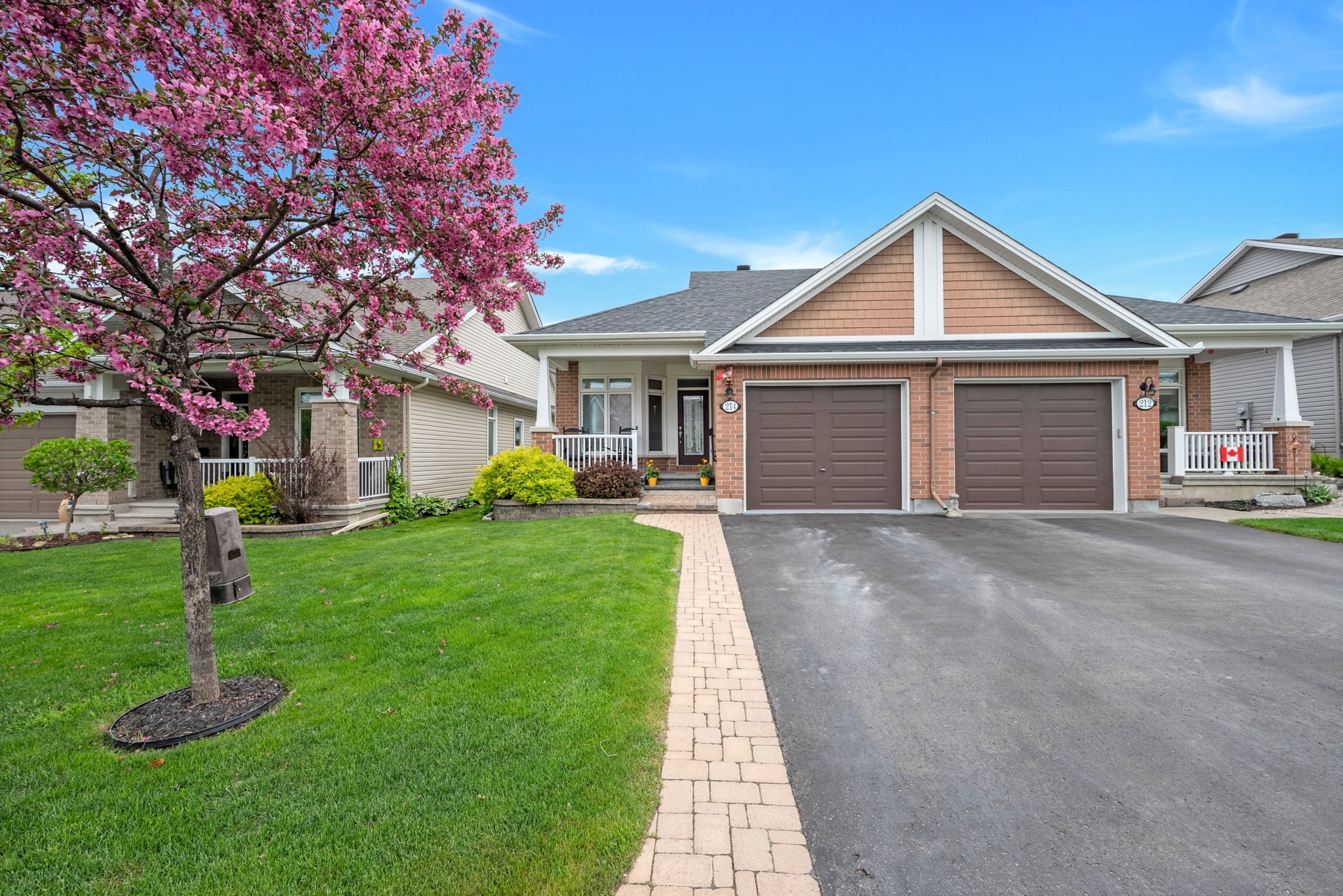 Tucked away on a peaceful street in the highly desirable Cardinal Creek community, this lovingly maintained semi-detached bungalow offers the perfect blend of comfort and practicality making this an ideal home for those looking to downsize without compromise. From the moment you arrive, the inviting front porch welcomes you home, hinting at the warmth and thoughtful design that awaits inside. Freshly painted, this bright and thoughtfully planned main floor features a dedicated study, perfect as a home office, craft room, or cozy TV den, paired with a smart, open-concept layout ideal for everyday living and effortless entertaining. The kitchen is a true highlight, boasting upgraded countertops that offer plenty of workspace, a centre island, upgraded cabinetry with ample storage including pots and pans drawers and spice pullout, all seamlessly connected to the spacious living and dining area. Step through the patio doors to the landscaped backyard with BBQ gas line where a large stone patio and fully enclosed cedar gazebo creates a private and peaceful space for morning coffee, summer BBQs, or serene birdwatching. The primary bedroom serves as a tranquil retreat, complete with a walk-in closet, additional wardrobe space, and a private ensuite featuring upgraded cabinetry, modern countertops, and a converted walk-in shower. A combined laundry and powder room layout adds convenience and flexibility to daily routines, while inside access from the insulated garage ensures year-round ease. The finished lower level extends your living space with a spacious recreation room, a second bedroom with a walk-in closet, a three-piece bathroom, and ample storage for all your extras. Enjoy low maintenance living just moments from walking paths, parks, transit, and everyday amenities. Some Photos Virtually Staged.