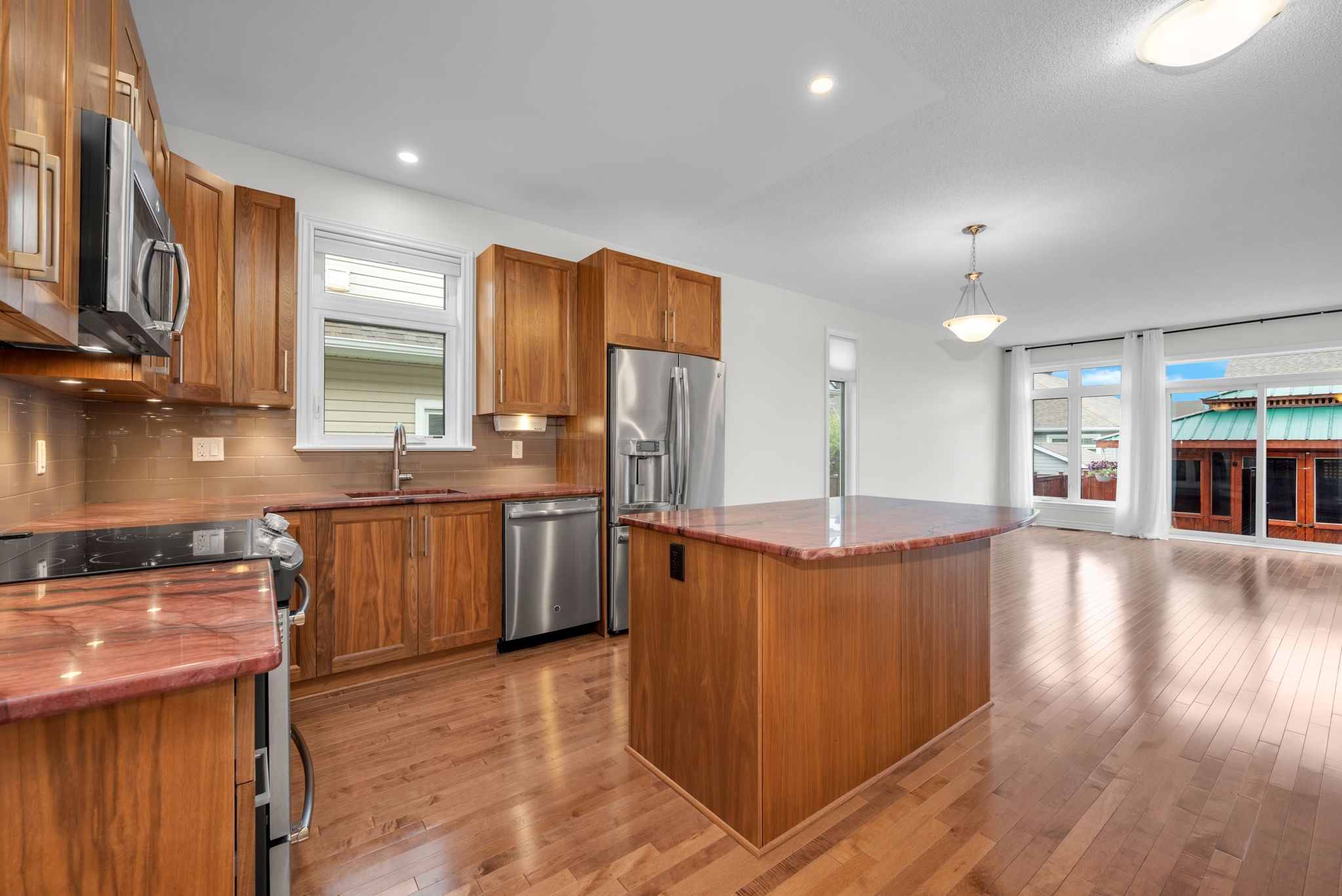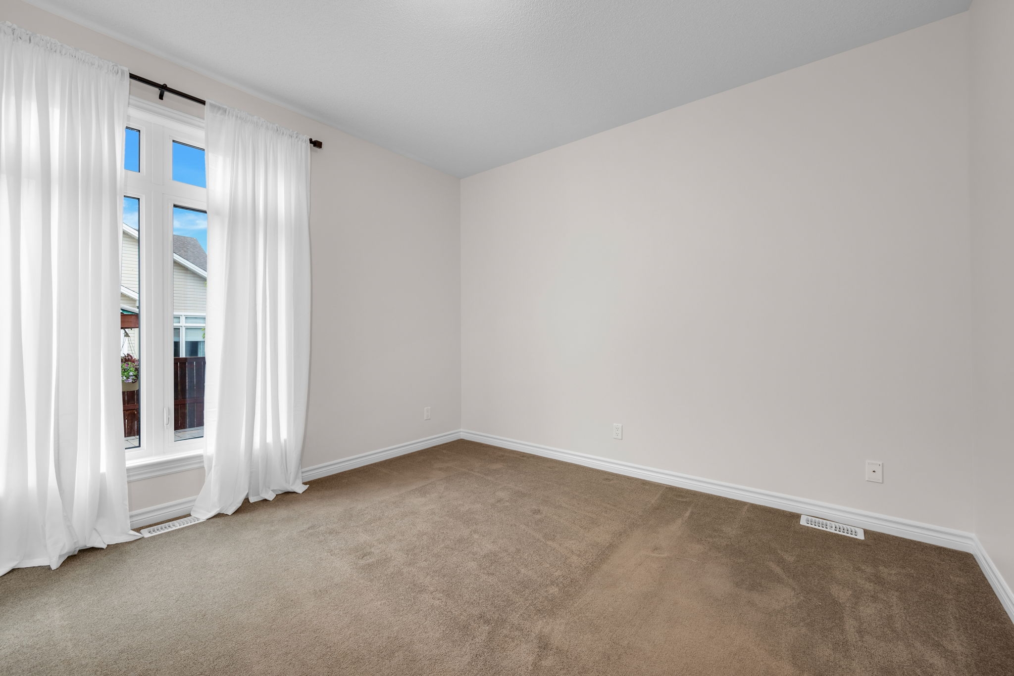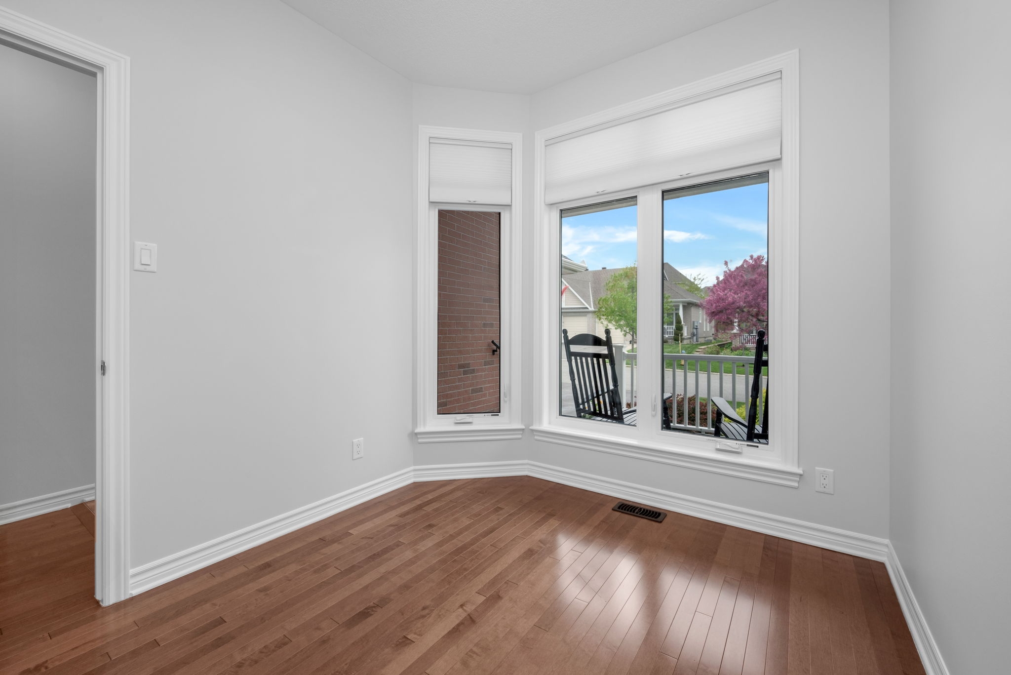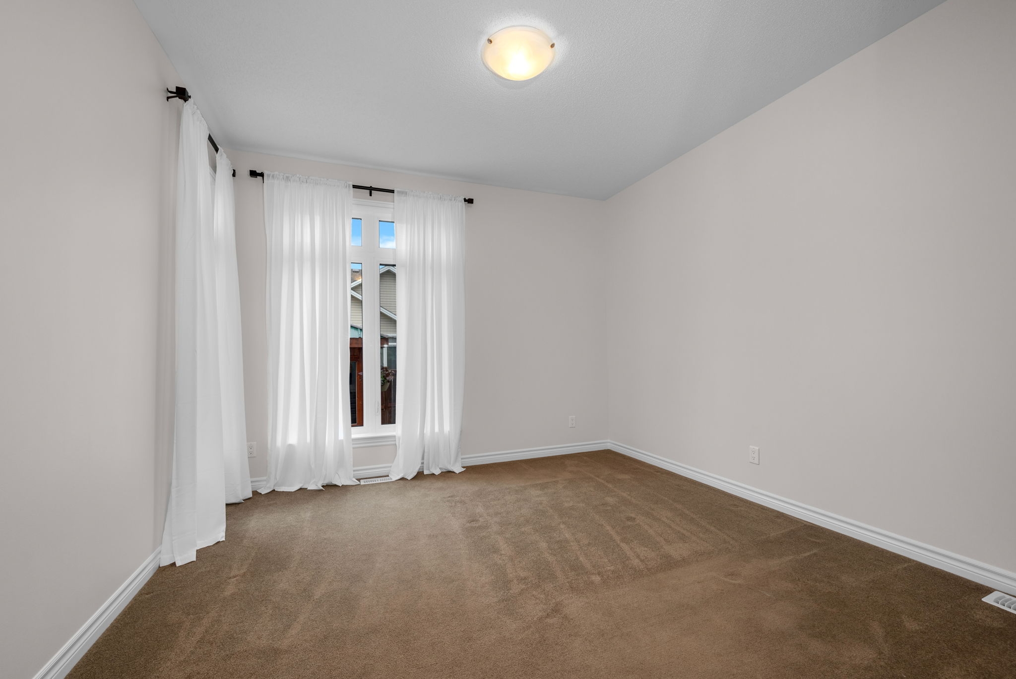 Tucked away on a peaceful street in the highly desirable Cardinal Creek community, this lovingly maintained semi-detached bungalow offers the perfect blend of comfort and practicality making this an ideal home for those looking to downsize without compromise. From the moment you arrive, the inviting front porch welcomes you home, hinting at the warmth and thoughtful design that awaits inside. Freshly painted, this bright and thoughtfully planned main floor features a dedicated study, perfect as a home office, craft room, or cozy TV den, paired with a smart, open-concept layout ideal for everyday living and effortless entertaining. The kitchen is a true highlight, boasting upgraded countertops that offer plenty of workspace, a centre island, upgraded cabinetry with ample storage including pots and pans drawers and spice pullout, all seamlessly connected to the spacious living and dining area. Step through the patio doors to the landscaped backyard with BBQ gas line where a large stone patio and fully enclosed cedar gazebo creates a private and peaceful space for morning coffee, summer BBQs, or serene birdwatching. The primary bedroom serves as a tranquil retreat, complete with a walk-in closet, additional wardrobe space, and a private ensuite featuring upgraded cabinetry, modern countertops, and a converted walk-in shower. A combined laundry and powder room layout adds convenience and flexibility to daily routines, while inside access from the insulated garage ensures year-round ease. The finished lower level extends your living space with a spacious recreation room, a second bedroom with a walk-in closet, a three-piece bathroom, and ample storage for all your extras. Enjoy low maintenance living just moments from walking paths, parks, transit, and everyday amenities. Some Photos Virtually Staged.