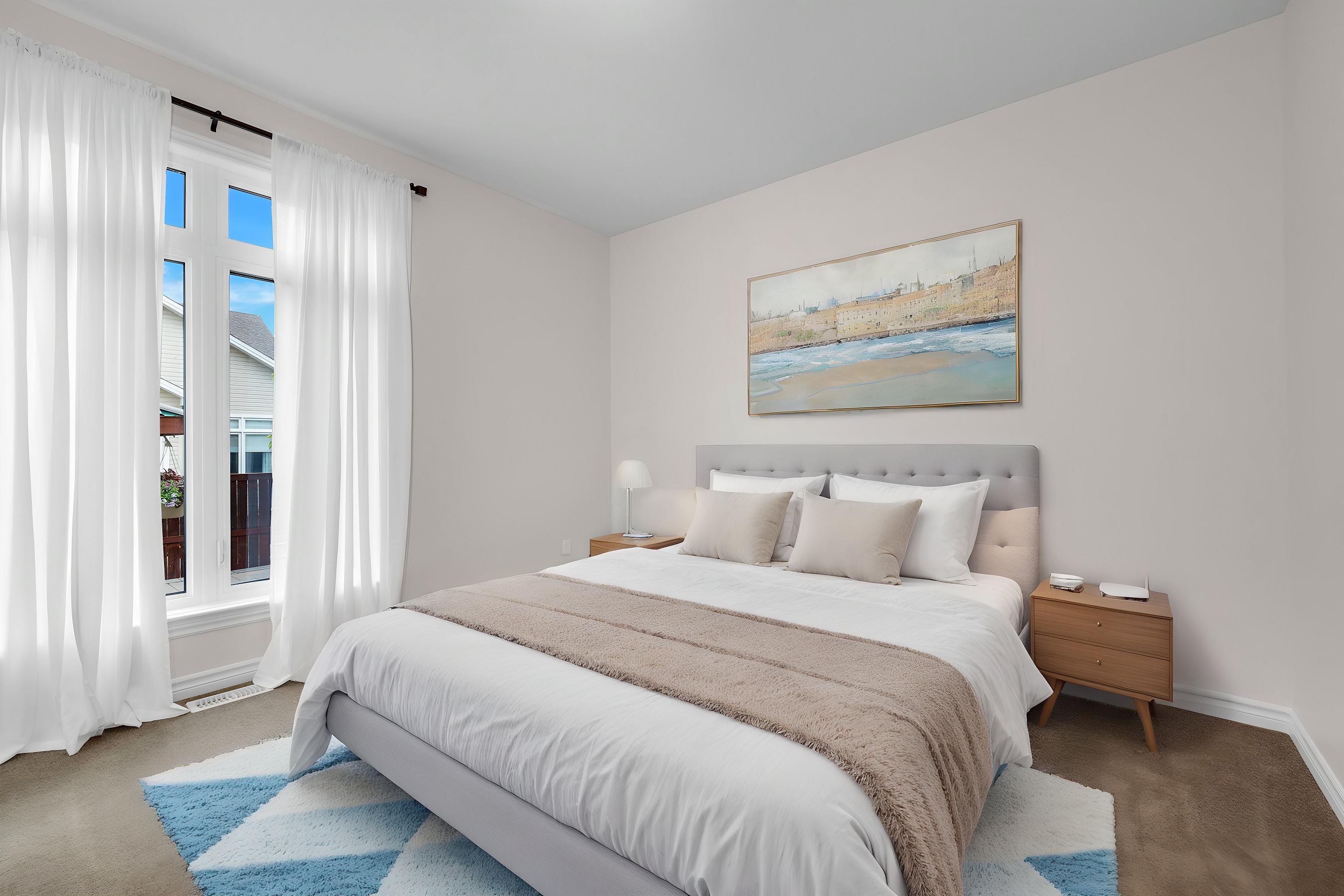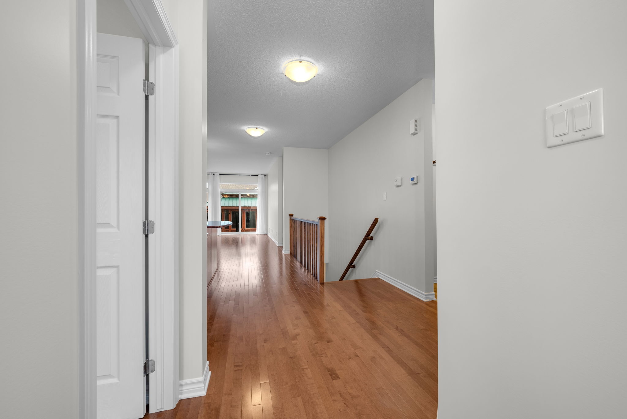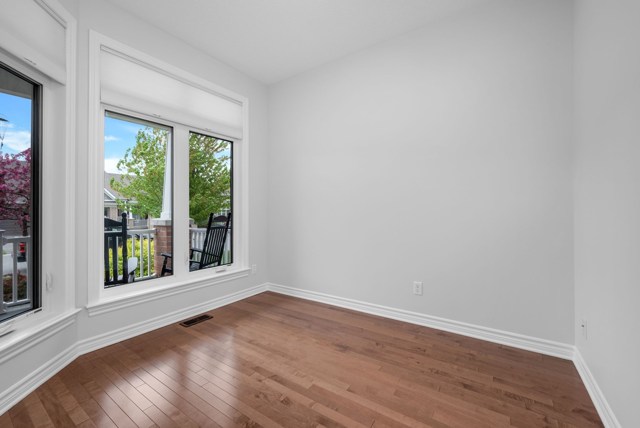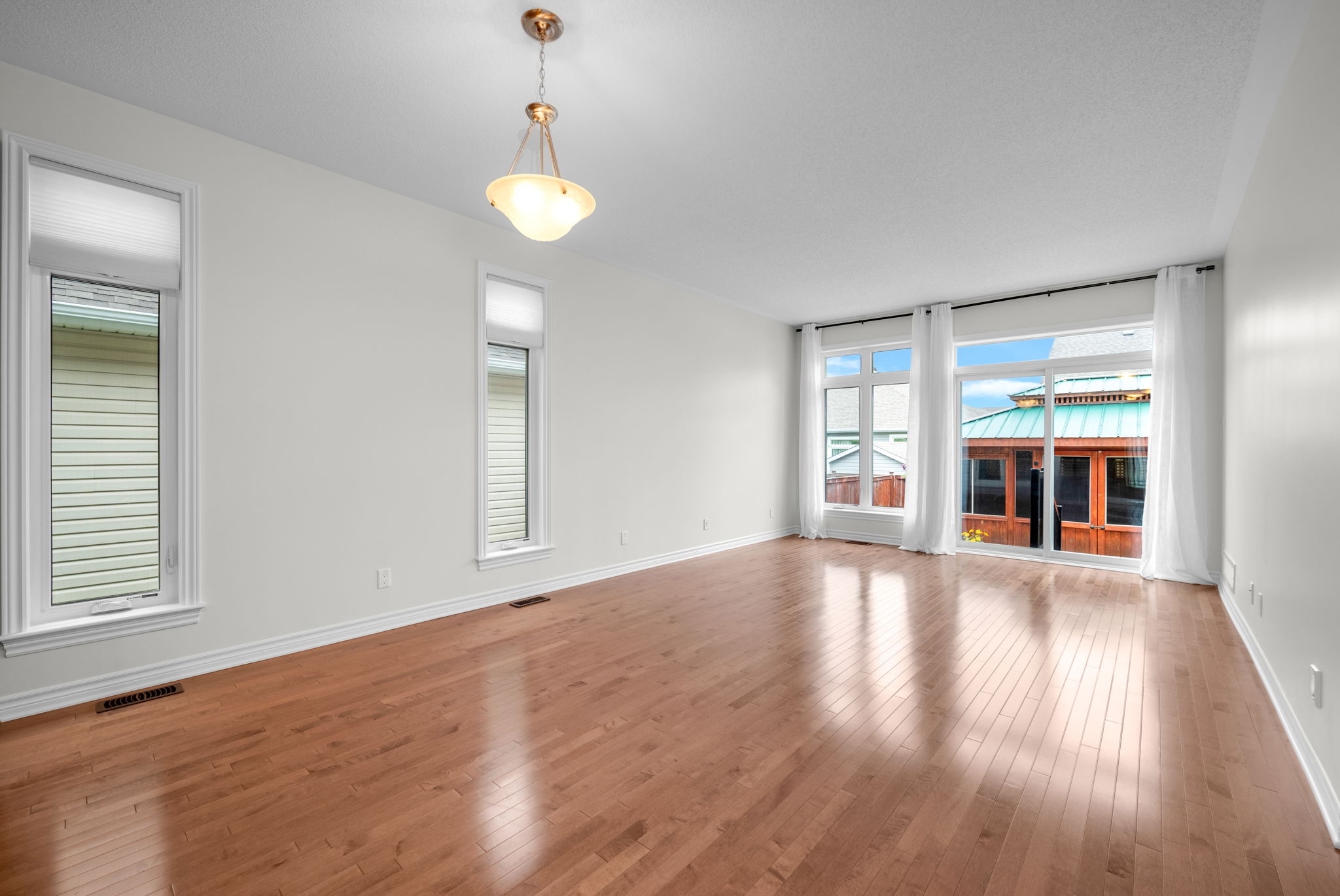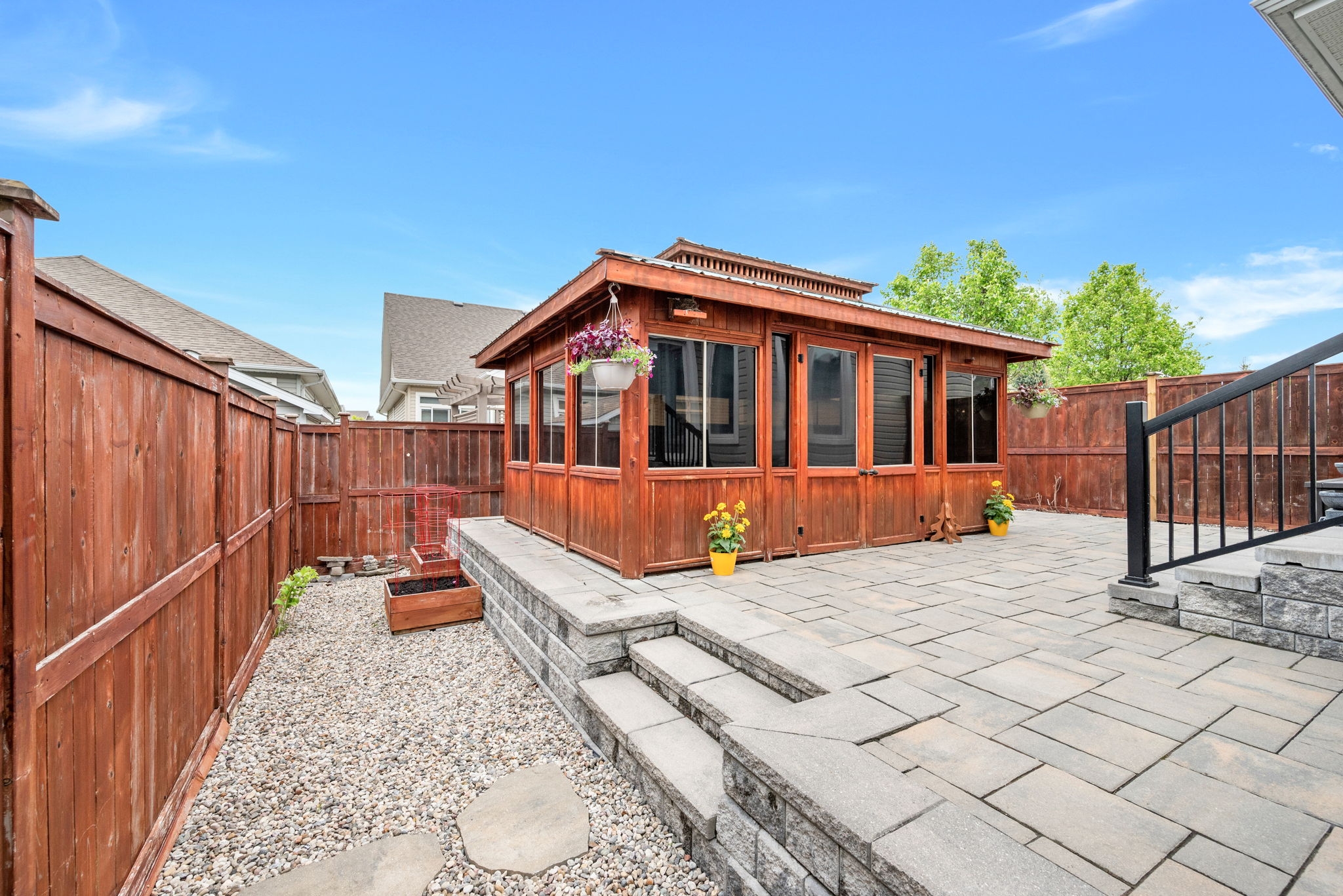 Tucked away on a peaceful street in the highly desirable Cardinal Creek community, this lovingly maintained semi-detached bungalow offers the perfect blend of comfort and practicality making this an ideal home for those looking to downsize without compromise. From the moment you arrive, the inviting front porch welcomes you home, hinting at the warmth and thoughtful design that awaits inside. Freshly painted, this bright and thoughtfully planned main floor features a dedicated study, perfect as a home office, craft room, or cozy TV den, paired with a smart, open-concept layout ideal for everyday living and effortless entertaining. The kitchen is a true highlight, boasting upgraded countertops that offer plenty of workspace, a centre island, upgraded cabinetry with ample storage including pots and pans drawers and spice pullout, all seamlessly connected to the spacious living and dining area. Step through the patio doors to the landscaped backyard with BBQ gas line where a large stone patio and fully enclosed cedar gazebo creates a private and peaceful space for morning coffee, summer BBQs, or serene birdwatching. The primary bedroom serves as a tranquil retreat, complete with a walk-in closet, additional wardrobe space, and a private ensuite featuring upgraded cabinetry, modern countertops, and a converted walk-in shower. A combined laundry and powder room layout adds convenience and flexibility to daily routines, while inside access from the insulated garage ensures year-round ease. The finished lower level extends your living space with a spacious recreation room, a second bedroom with a walk-in closet, a three-piece bathroom, and ample storage for all your extras. Enjoy low maintenance living just moments from walking paths, parks, transit, and everyday amenities. Some Photos Virtually Staged.