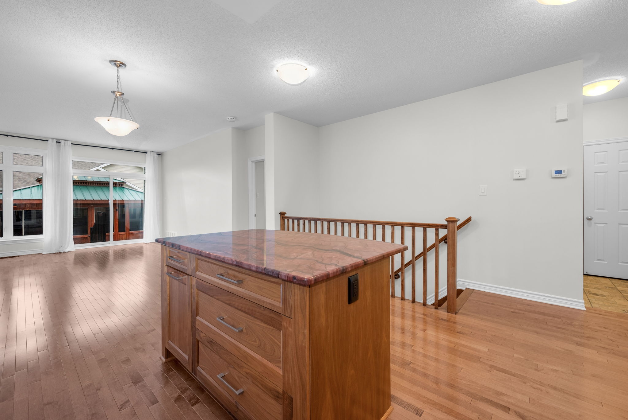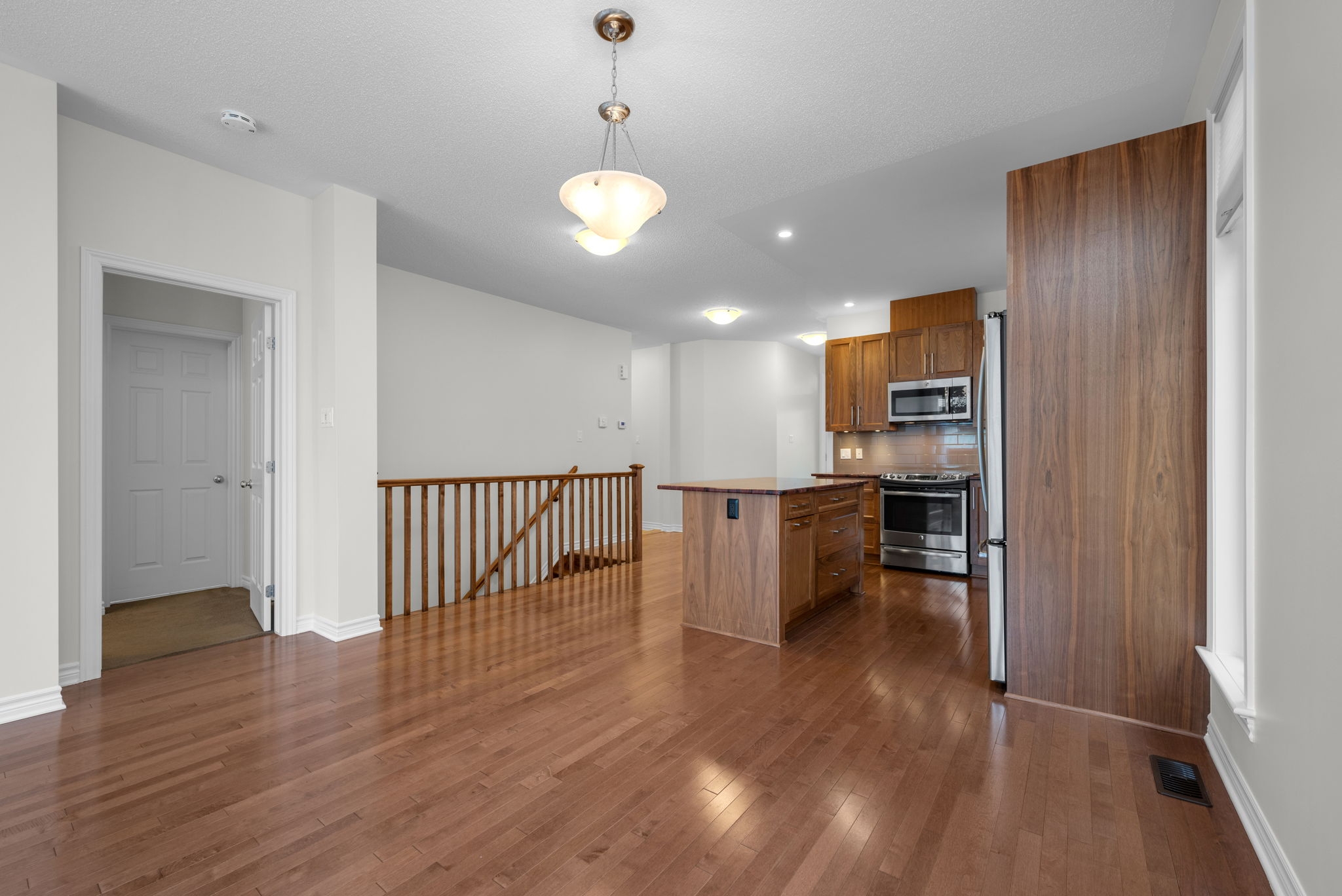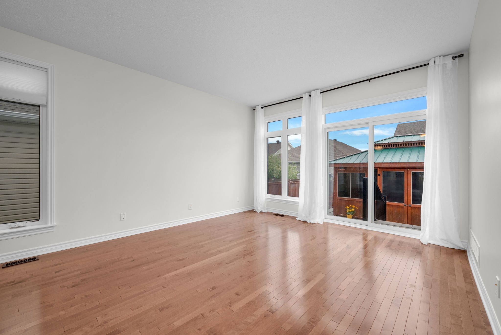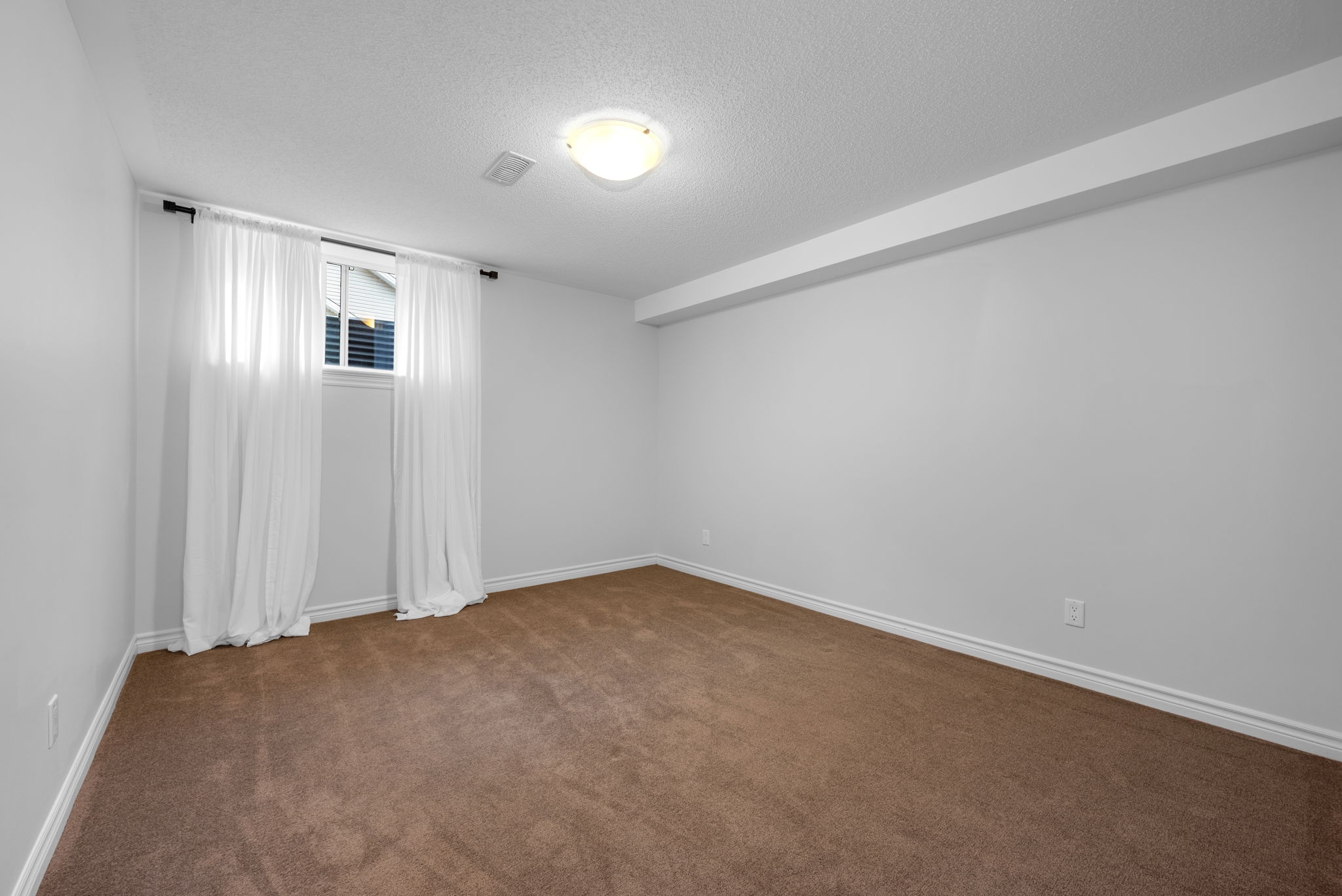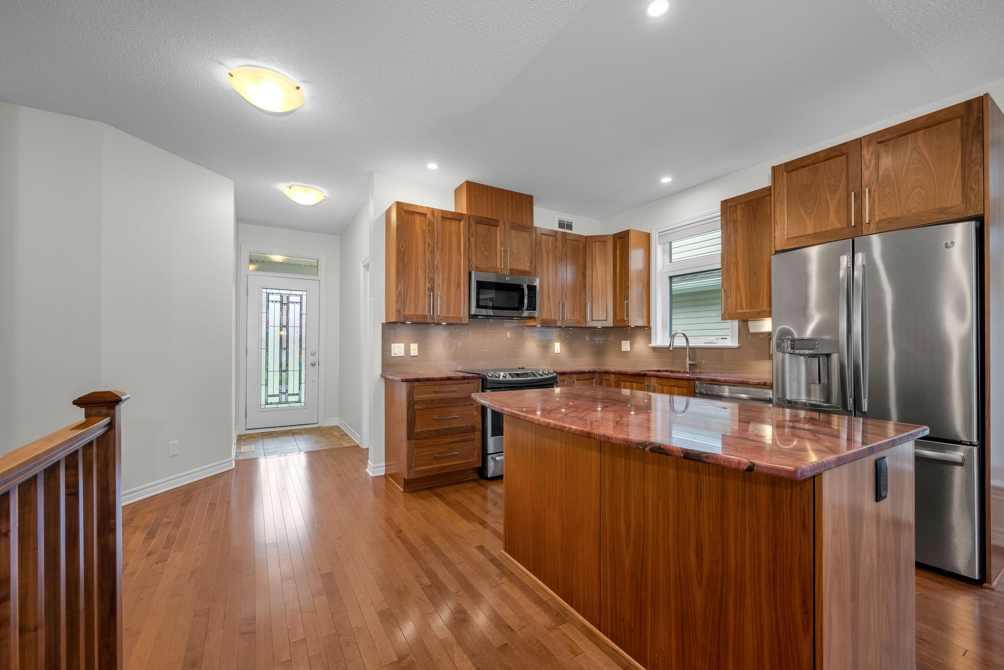 Tucked away on a peaceful street in the highly desirable Cardinal Creek community, this lovingly maintained semi-detached bungalow offers the perfect blend of comfort and practicality making this an ideal home for those looking to downsize without compromise. From the moment you arrive, the inviting front porch welcomes you home, hinting at the warmth and thoughtful design that awaits inside. Freshly painted, this bright and thoughtfully planned main floor features a dedicated study, perfect as a home office, craft room, or cozy TV den, paired with a smart, open-concept layout ideal for everyday living and effortless entertaining. The kitchen is a true highlight, boasting upgraded countertops that offer plenty of workspace, a centre island, upgraded cabinetry with ample storage including pots and pans drawers and spice pullout, all seamlessly connected to the spacious living and dining area. Step through the patio doors to the landscaped backyard with BBQ gas line where a large stone patio and fully enclosed cedar gazebo creates a private and peaceful space for morning coffee, summer BBQs, or serene birdwatching. The primary bedroom serves as a tranquil retreat, complete with a walk-in closet, additional wardrobe space, and a private ensuite featuring upgraded cabinetry, modern countertops, and a converted walk-in shower. A combined laundry and powder room layout adds convenience and flexibility to daily routines, while inside access from the insulated garage ensures year-round ease. The finished lower level extends your living space with a spacious recreation room, a second bedroom with a walk-in closet, a three-piece bathroom, and ample storage for all your extras. Enjoy low maintenance living just moments from walking paths, parks, transit, and everyday amenities. Some Photos Virtually Staged.