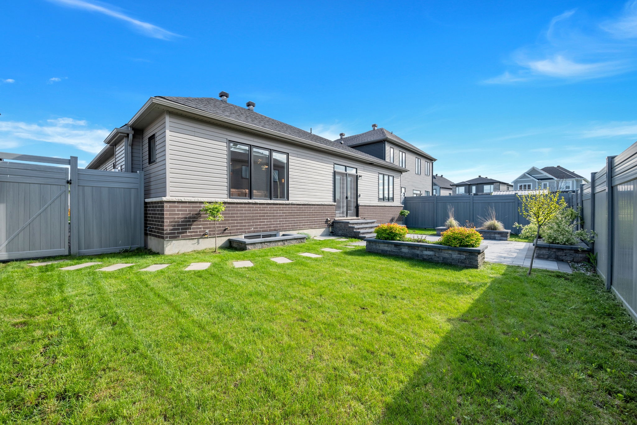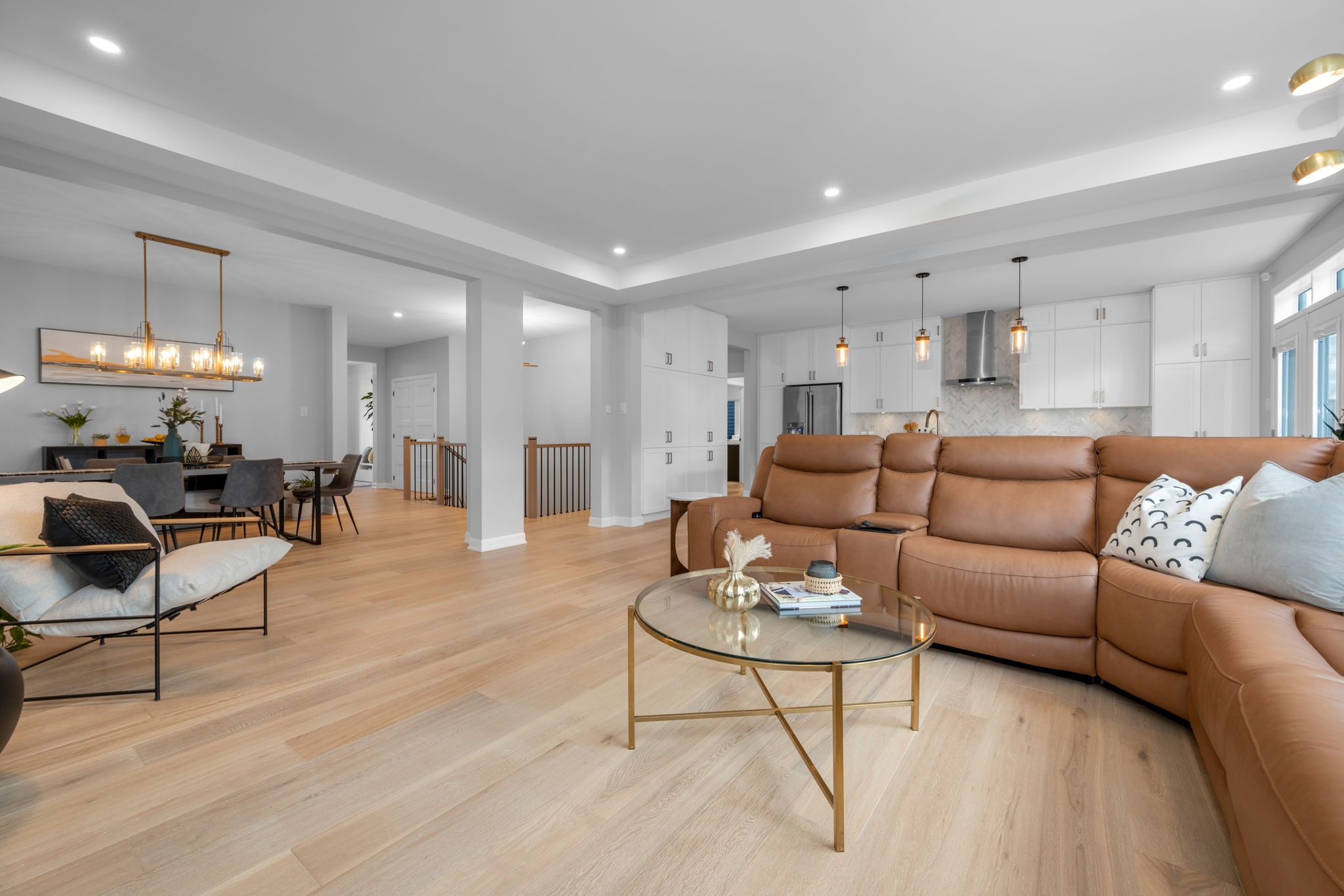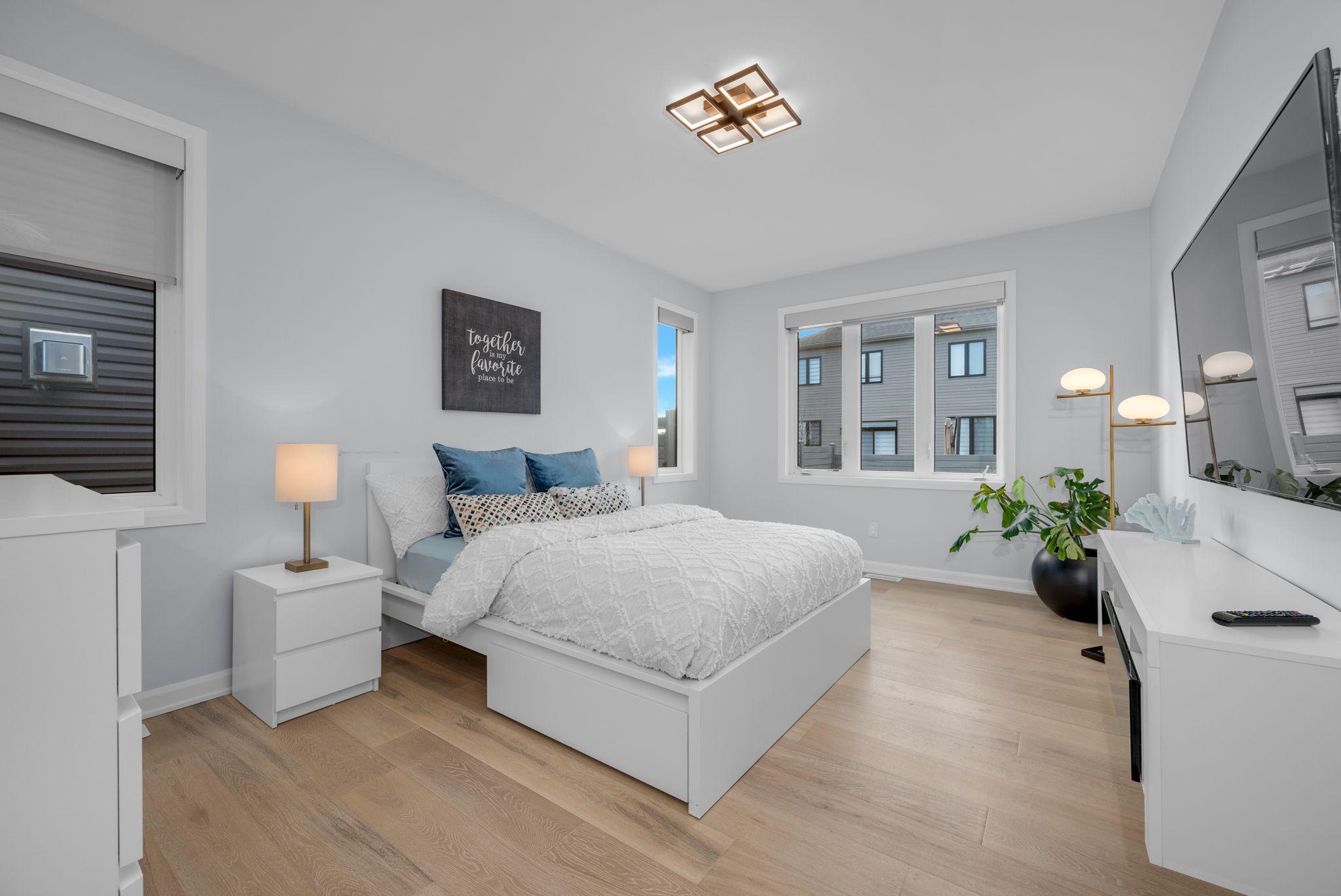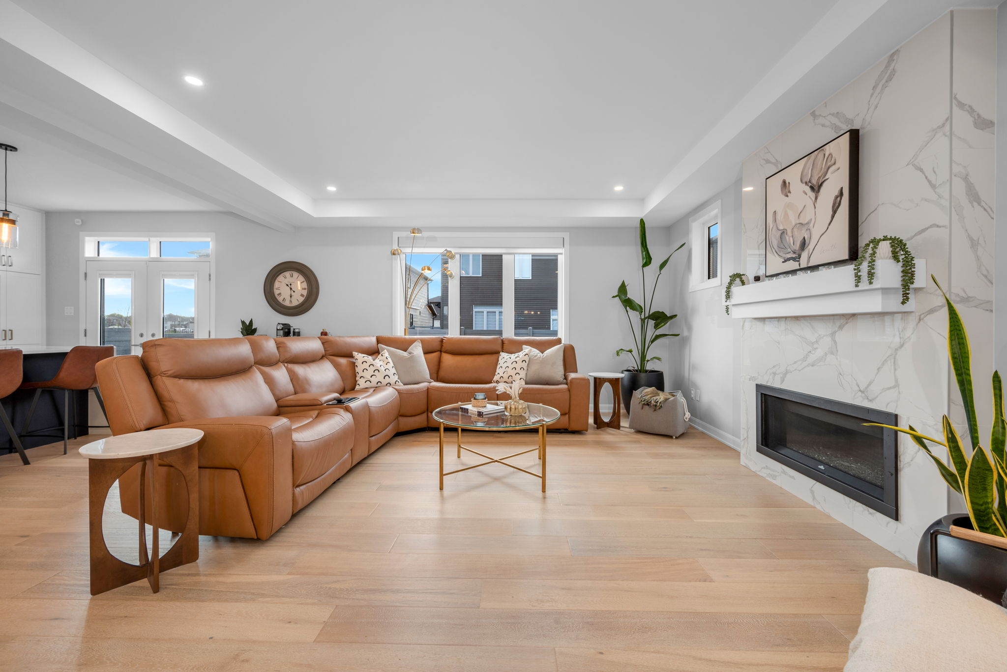 Experience elegance in this stunning 2+2 bedroom bungalow, showcasing refined décor and exceptional features. Permanent celebration lighting and upgraded exterior fixtures enhance its curb appeal, complemented by the interlock walkway and covered veranda with pot lights. A full security system ensures peace of mind.Step through the grand 8-foot high front door into a foyer with oversized tile, high baseboards, and 9-foot flat ceilings. Sophistication continues with five-panel interior doors, wide-plank hardwood floors, and upgraded light fixtures throughout.The chefs kitchen features a centre island with breakfast bar, quartz countertops with a striking waterfall edge, and stylish two-tone cabinetry. Most blinds are motorized, effortlessly controlling natural light. Twin dining room windows brighten the space, while the living room boasts a bold vertical gas fireplace.The primary suite offers a walk-in closet and a luxurious 5-piece ensuite with a glass shower, standalone tub, and twin sink vanity. A second bedroom with an oversized window and a well-appointed 5-piece main bath complete the main level.Main-floor laundry includes quartz countertops. An open hardwood staircase leads to an expansive lower level with a rec room, den, and two additional bedrooms. The kitchenette has quartz countertops and a wine fridge, while the spa-like 5-piece bath features radiant floor heating, a full-body wash shower, linen storage, and a private sauna.The PVC fenced yard provides a retreat with an interlock patio. The fully custom heated garage features a natural gas heater, EV charger, custom storage, and newly re-finished flooring in 2024, plus floor-to-ceiling slatwalls for optimal organization. Upgrades include an automatic natural gas generator (2023), three rear gas hookups for BBQs and fire pits, California Closets (2023), and interlock landscaping (2023).