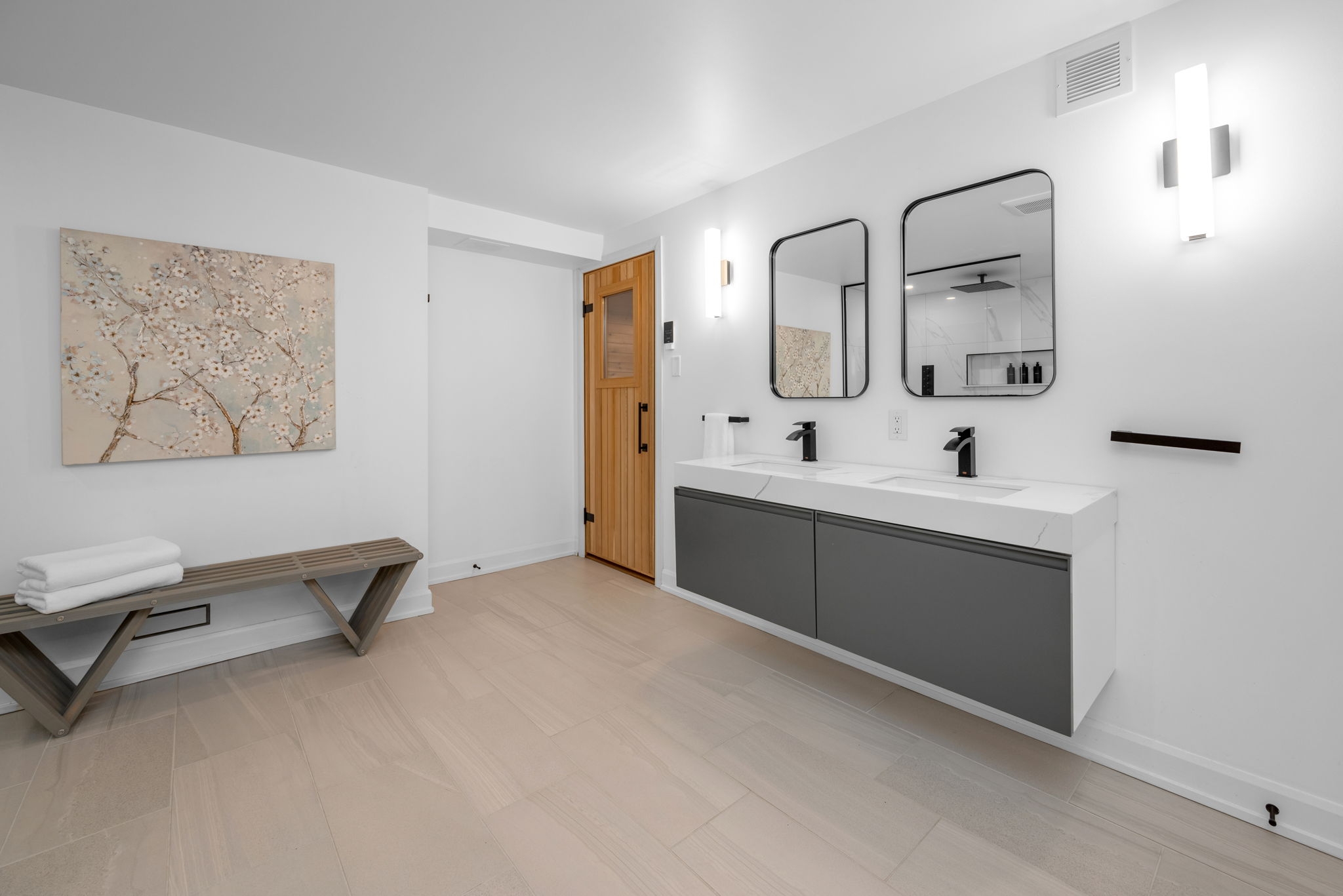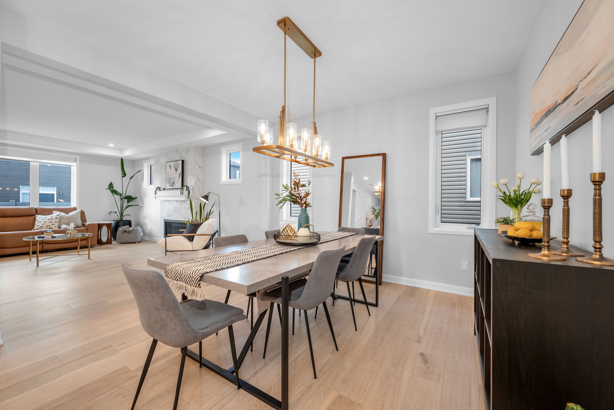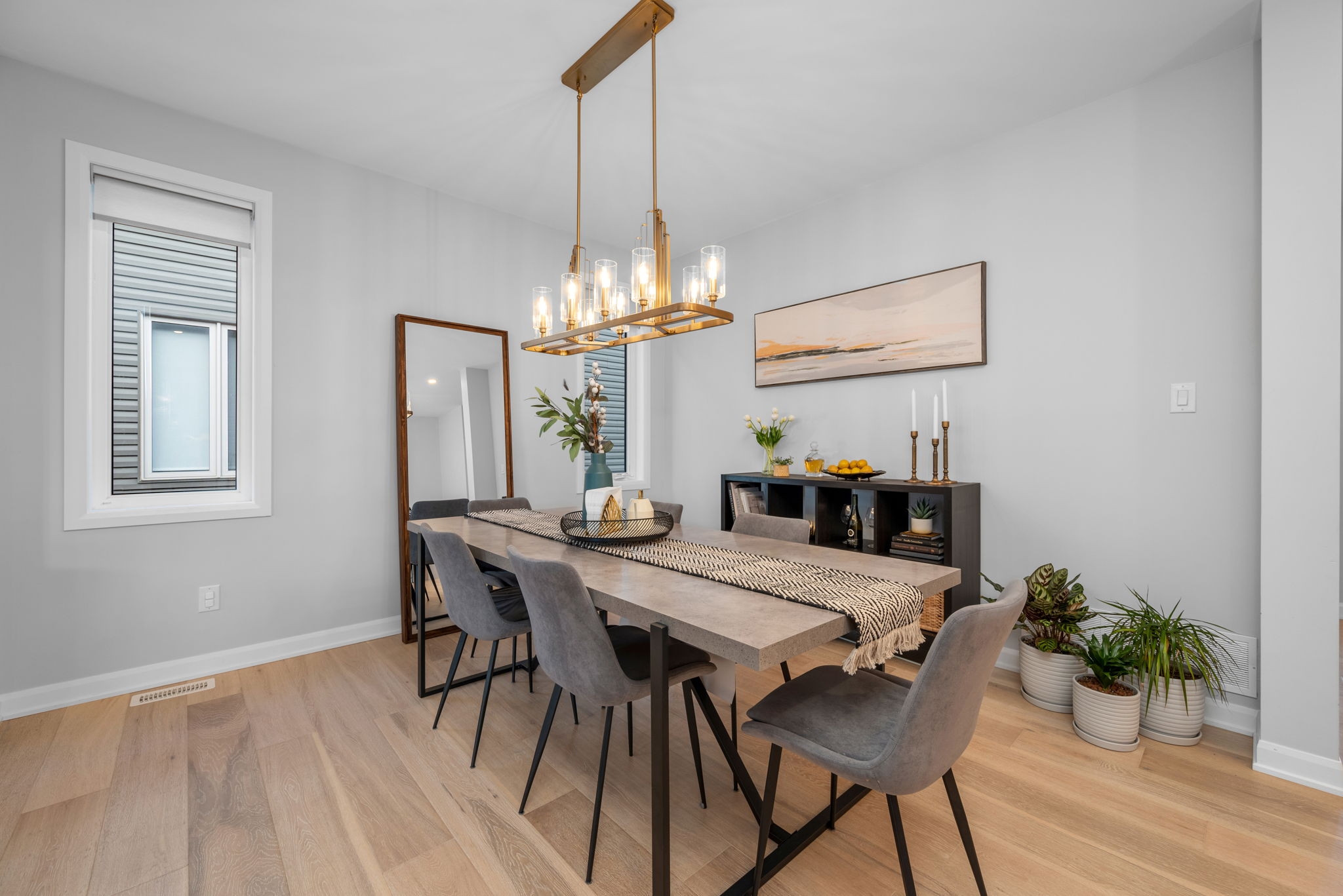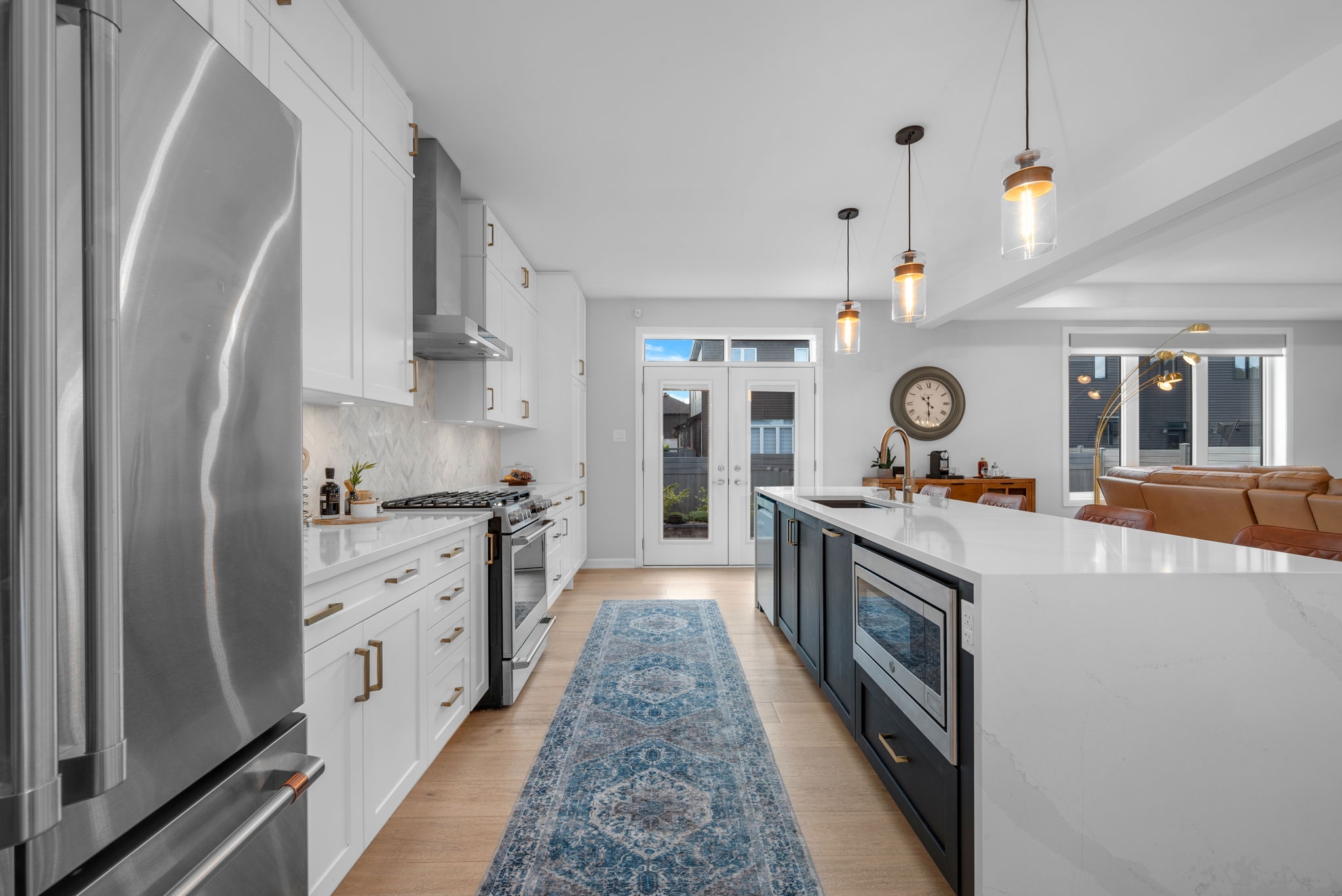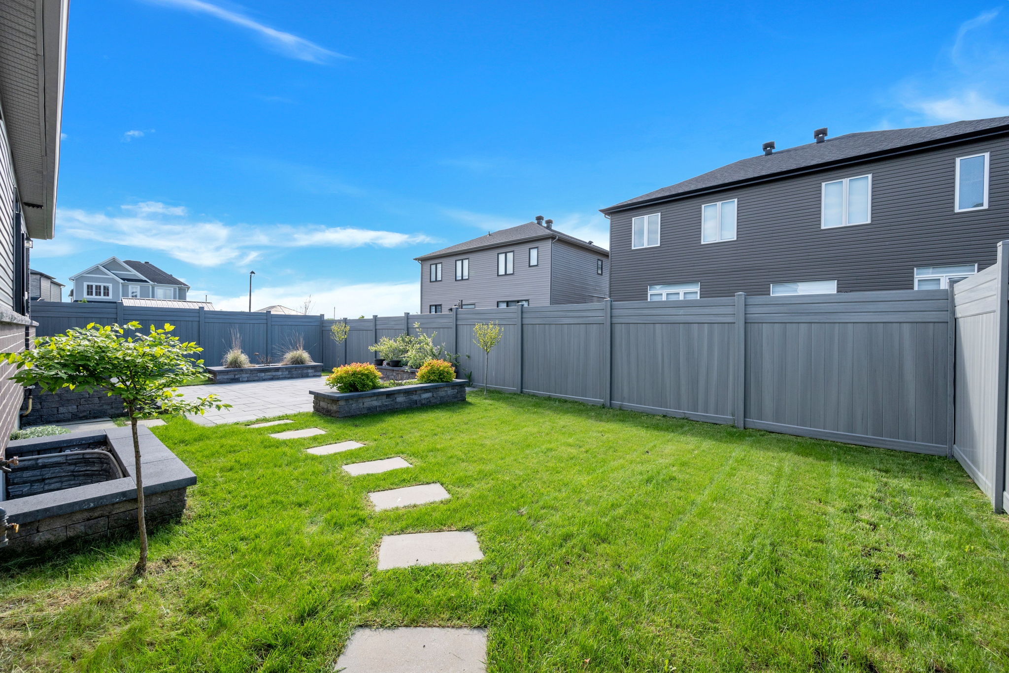 Experience elegance in this stunning 2+2 bedroom bungalow, showcasing refined décor and exceptional features. Permanent celebration lighting and upgraded exterior fixtures enhance its curb appeal, complemented by the interlock walkway and covered veranda with pot lights. A full security system ensures peace of mind.Step through the grand 8-foot high front door into a foyer with oversized tile, high baseboards, and 9-foot flat ceilings. Sophistication continues with five-panel interior doors, wide-plank hardwood floors, and upgraded light fixtures throughout.The chefs kitchen features a centre island with breakfast bar, quartz countertops with a striking waterfall edge, and stylish two-tone cabinetry. Most blinds are motorized, effortlessly controlling natural light. Twin dining room windows brighten the space, while the living room boasts a bold vertical gas fireplace.The primary suite offers a walk-in closet and a luxurious 5-piece ensuite with a glass shower, standalone tub, and twin sink vanity. A second bedroom with an oversized window and a well-appointed 5-piece main bath complete the main level.Main-floor laundry includes quartz countertops. An open hardwood staircase leads to an expansive lower level with a rec room, den, and two additional bedrooms. The kitchenette has quartz countertops and a wine fridge, while the spa-like 5-piece bath features radiant floor heating, a full-body wash shower, linen storage, and a private sauna.The PVC fenced yard provides a retreat with an interlock patio. The fully custom heated garage features a natural gas heater, EV charger, custom storage, and newly re-finished flooring in 2024, plus floor-to-ceiling slatwalls for optimal organization. Upgrades include an automatic natural gas generator (2023), three rear gas hookups for BBQs and fire pits, California Closets (2023), and interlock landscaping (2023).
