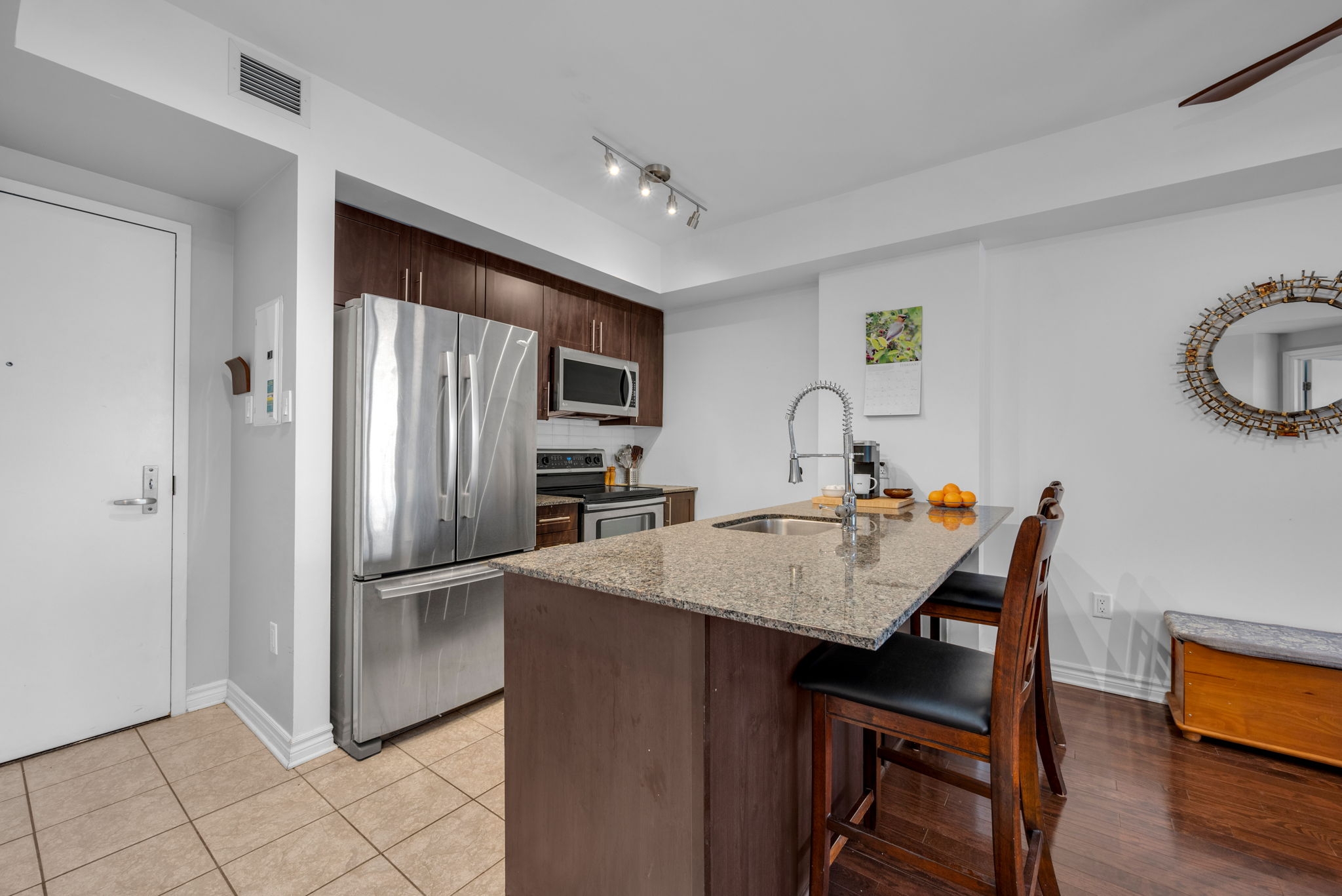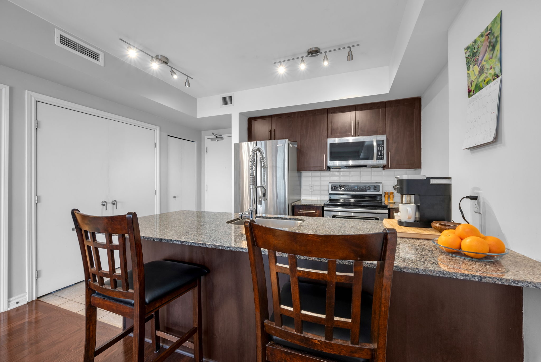 Welcome to this pristine condo in a highly sought-after location, just steps from all the boutiques, cafés, restaurants, and everyday conveniences that vibrant Beechwood Village has to offer.The popular Mackenzie model offers 675 sq. ft. of thoughtfully designed living space, blending functionality with tasteful, modern finishes throughout.The open-concept kitchen is both stylish and practical, featuring granite countertops, stainless steel appliances, upgraded faucet, tile flooring, and a convenient breakfast bar for casual dining. The flooring beautifully complements the kitchen cabinetry, creating a cohesive and elegant aesthetic.Engineered oak hardwood flows through the generous living and dining areas, offering flexibility for entertaining, relaxing, or even incorporating a comfortable home office setup. Large windows flood the space with natural light, while the private balcony showcases an amazing view and stunning vistas - the perfect backdrop to unwind at the end of the day.The well-proportioned bedroom shows beautifully showcasing laminate flooring, a large closet, and ample space for additional furnishings.The unit is rounded out by a stylish bathroom with tiled floors, convenient in-unit laundry, and extra storage/pantry space to keep everything neatly organized.Residents enjoy premium building amenities including an indoor pool and fully equipped fitness centre. Underground parking and a storage locker are also included for added convenience.An exceptional opportunity to own a bright, move-in-ready condo in one of the city's most desirable neighbourhoods.